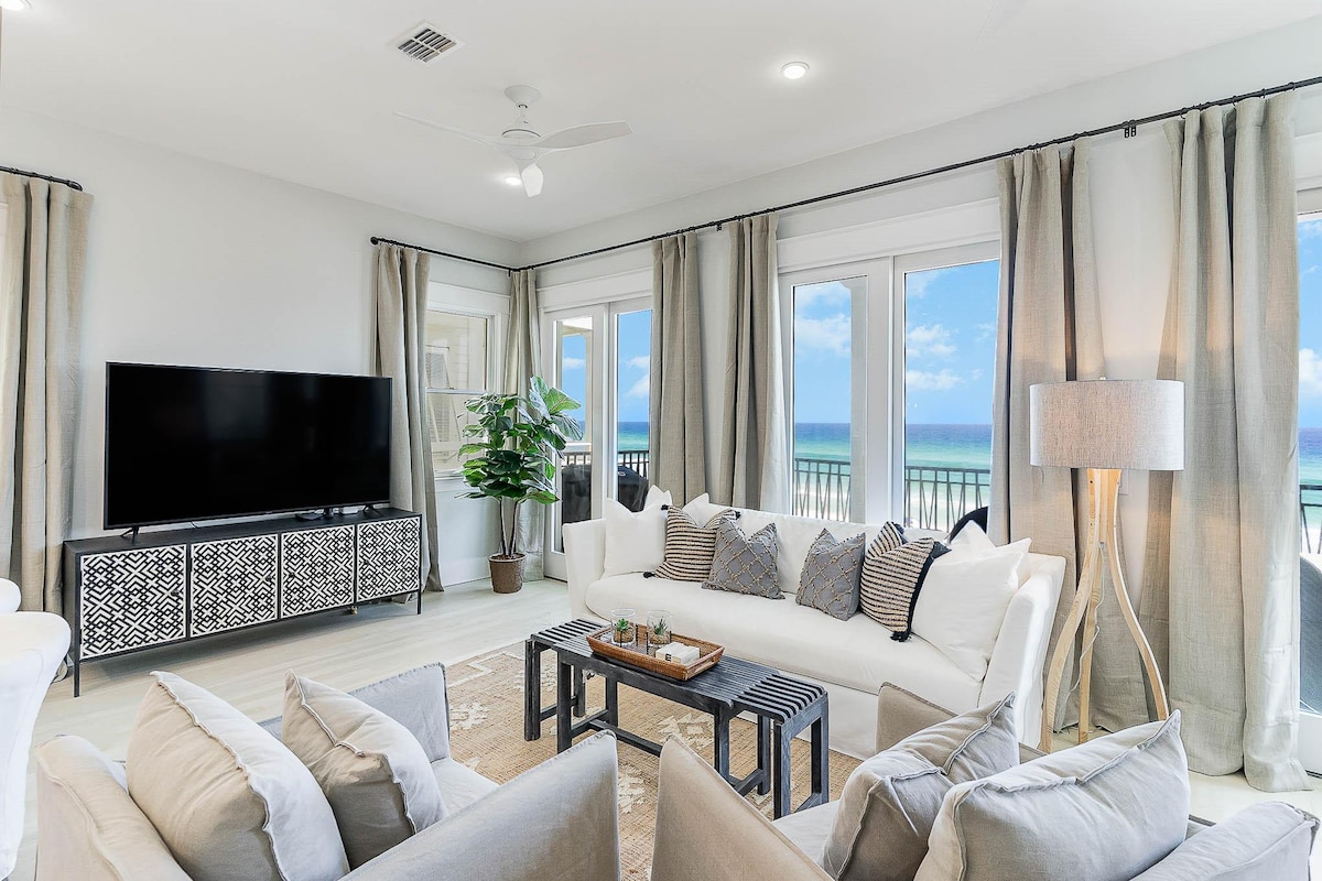 ✹ Living Room with a large comfortable sectional, Gulf views, and a HUGE 75” Smart TV - watch the big game with a view!