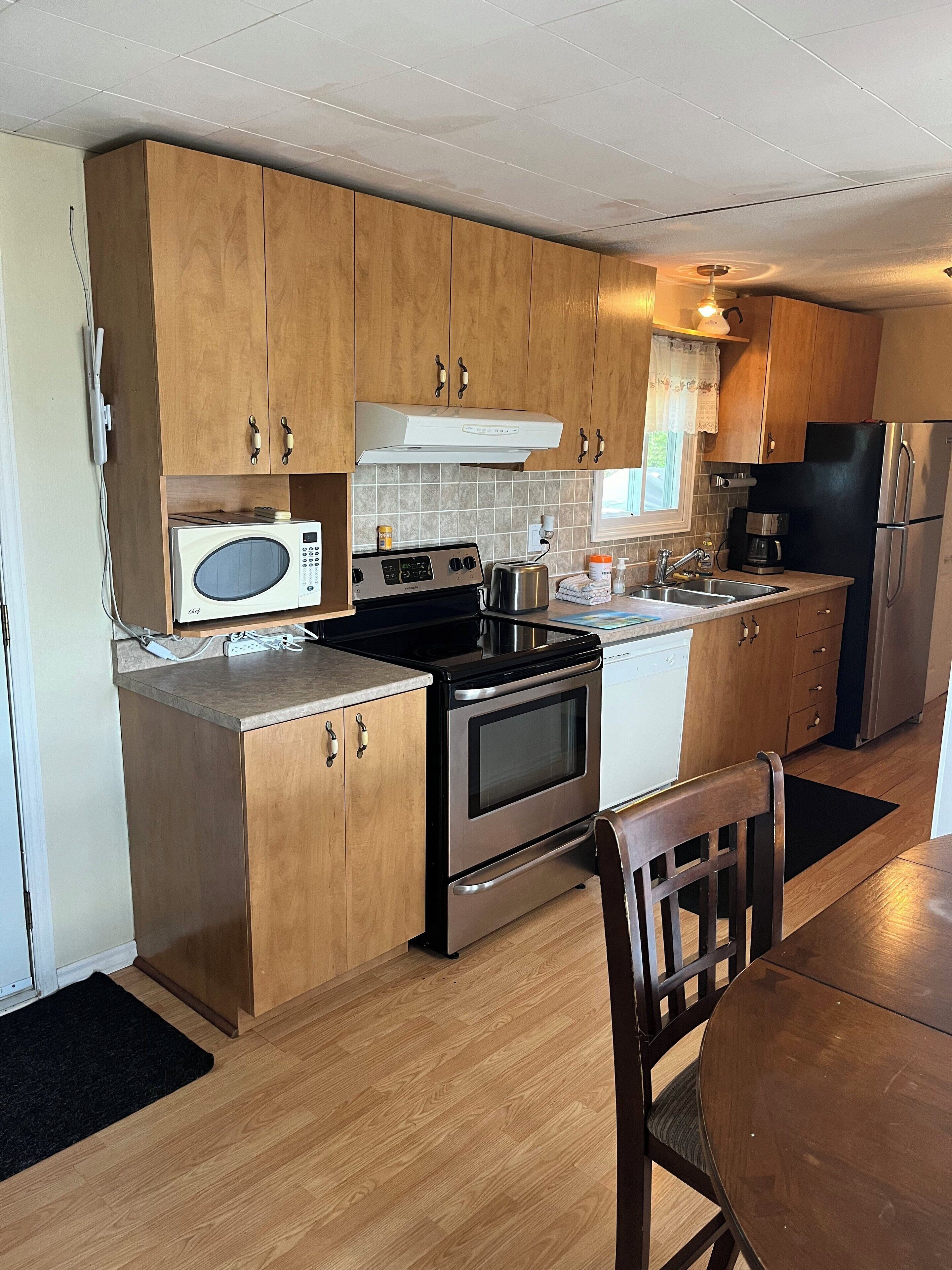 Fridge, stove, microwave oven, outdoor fireplace, coffee makers, dishes, cookware, bedding, toilet paper.
