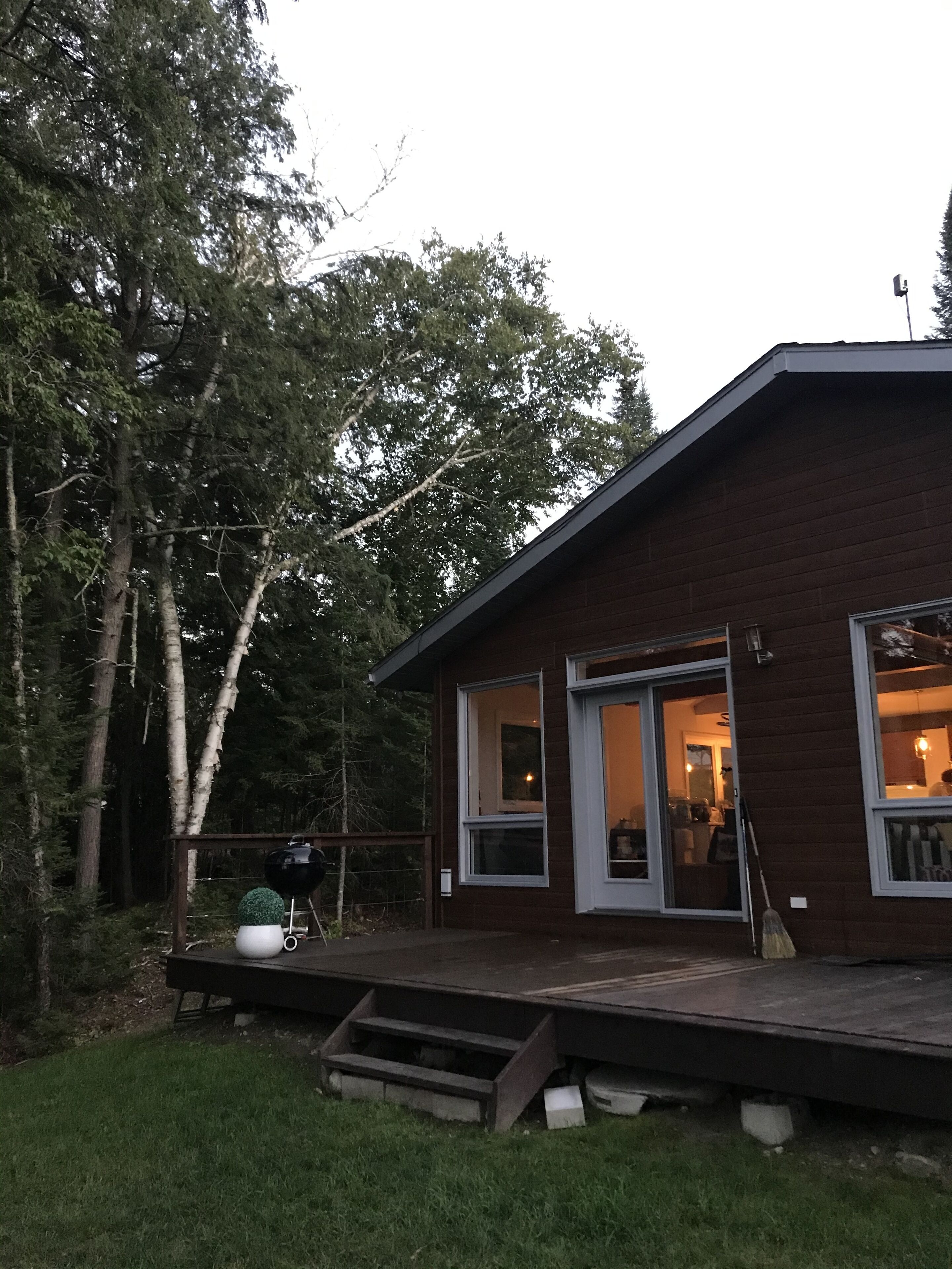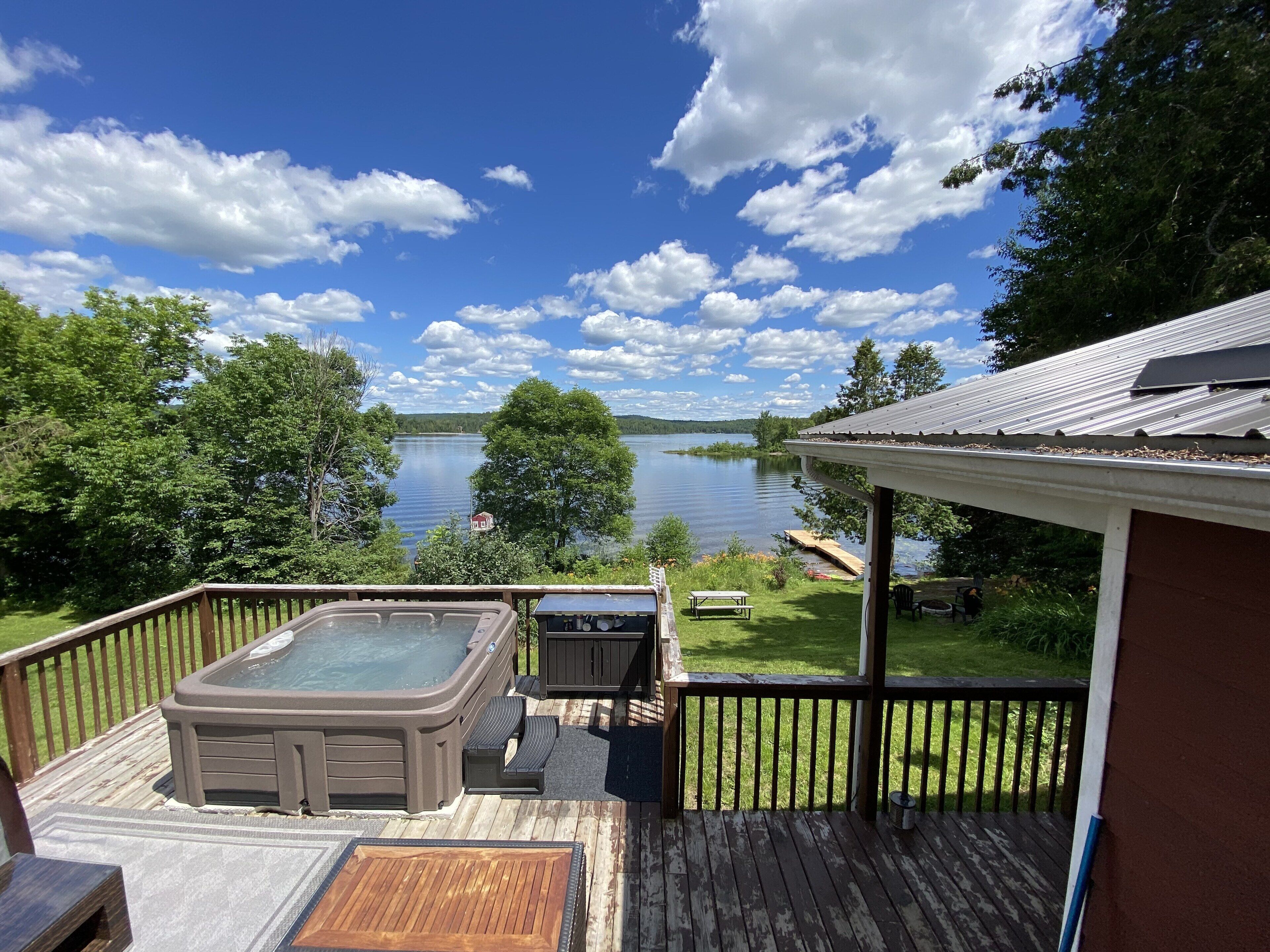 - "Beautiful nature" - "It was right on the lake with a beautiful voew of the lake. The hottub was nice right beside the water. Quiet lake and a large area out front to play games." - "This cottage is beautiful and located right on the water. It seems like it was recently renovated and was just as nice on the inside as the outside. There’s an absolutely enormous front lawn which was great for games, and the lakefront was shallow and sandy. The part we loved most was the patio set directly on the dock; made it very easy to spend hours lazing in the sun! The hosts were very easy to contact and got back to us quickly. Loved it!"
