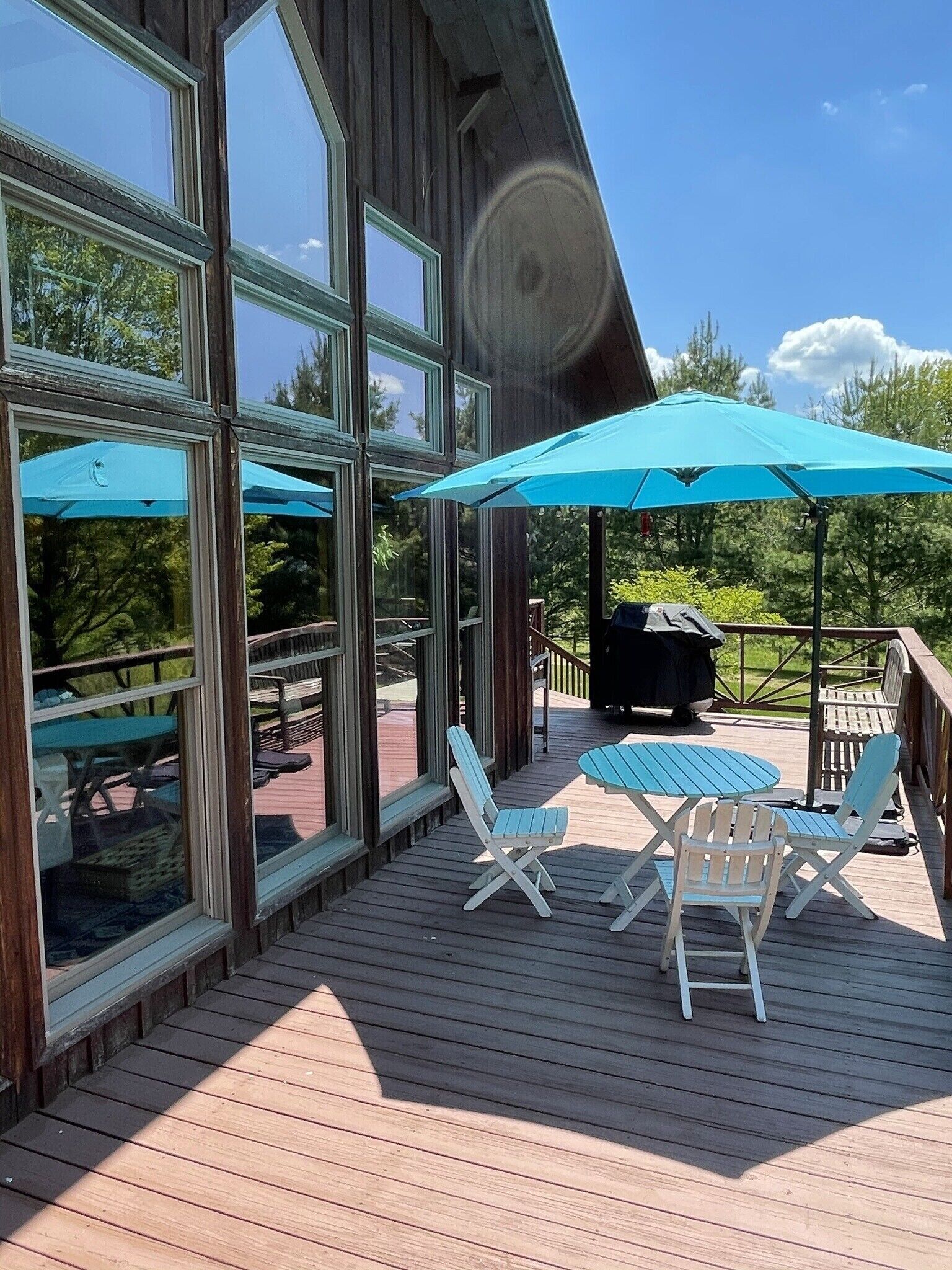 The outdoor areas at Fern Cottage are a true highlight. A spacious deck, framed by greenery and covered in climbing vines, provides a magical setting for outdoor dining or simply soaking up the expansive 30-mile mountain views. String lights add to the evening ambiance, making it a lovely spot for stargazing or enjoying a glass of wine as the sun sets.
