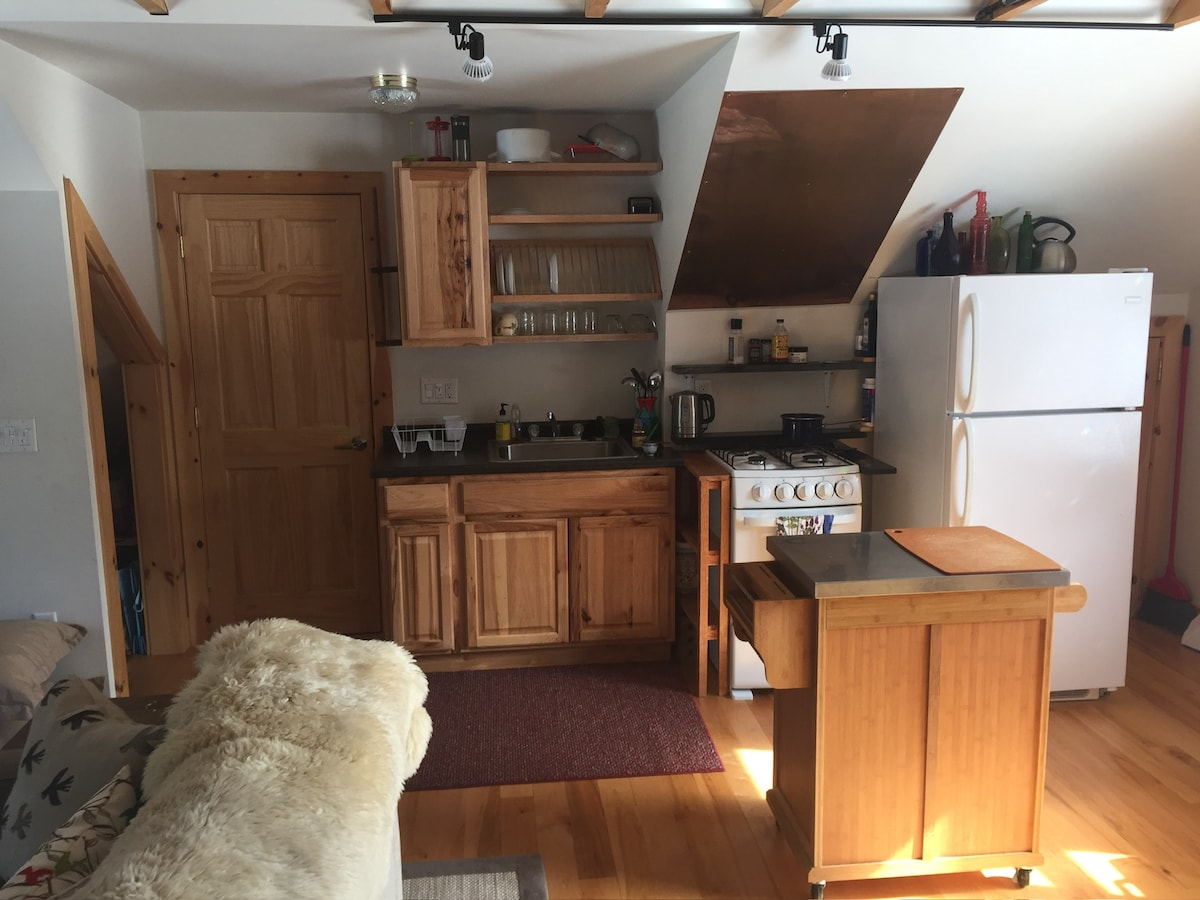 The studio is full walk out garden level in our home with a private entrance and outdoor space. It is a one room studio space with a private bathroom. The kitchenette has a small refrigerator, microwave, coffee maker and kettle but no stove.