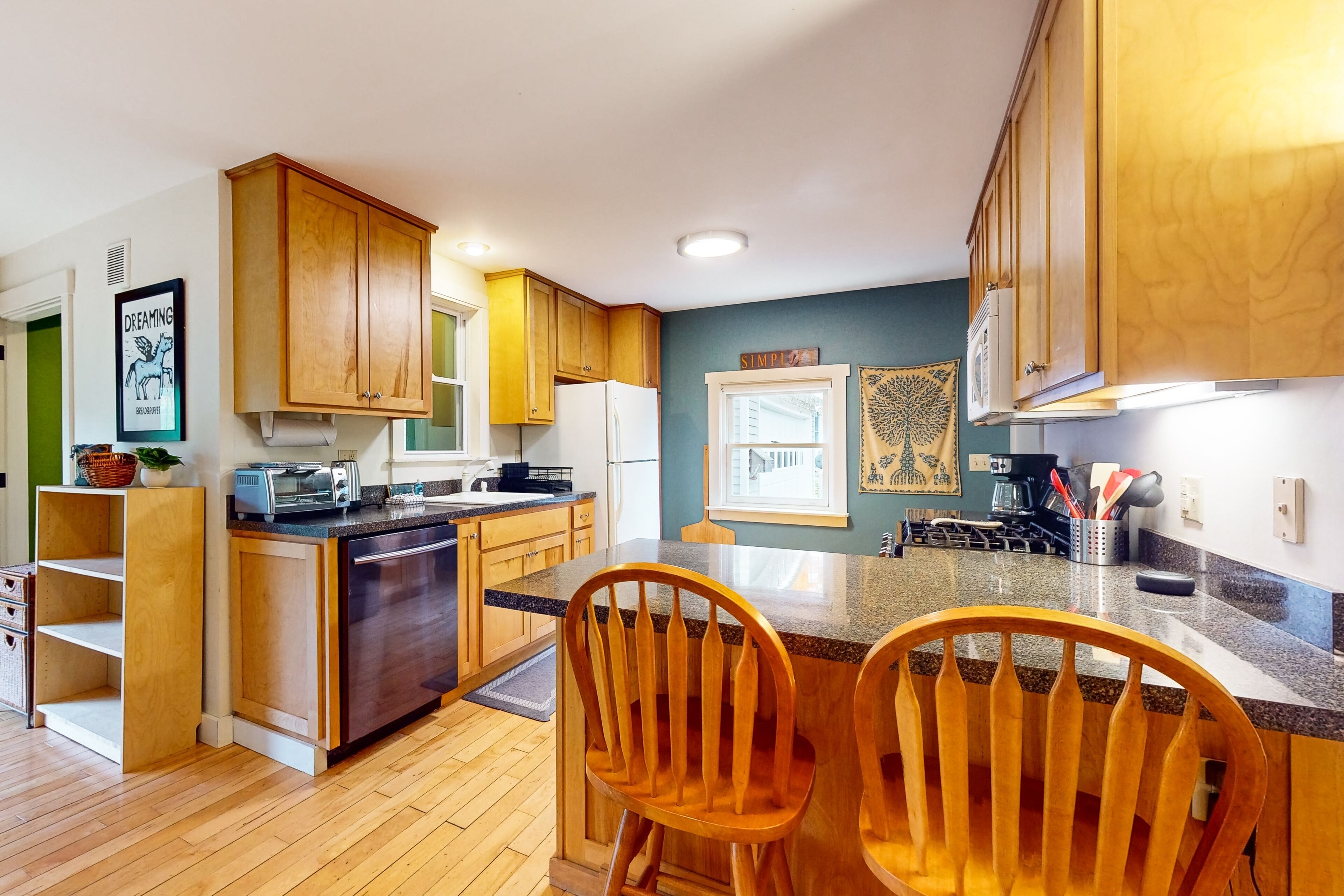 The kitchen is fully equipped with dishes, cookware, an electric stove and dishwasher. As a courtesy to guests, we provide coffee and tea makings, and an initial starting pack of paper products and cleaning supplies.