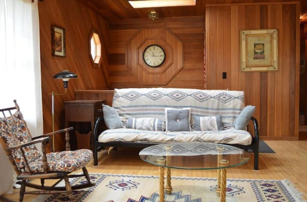 The apartment is located above Green House Pottery, a working ceramics studio and gallery. The apartment is located on the top two floors of the building, with the kitchen, living room, dining room and bathroom on the first floor, and two bedrooms on the second floor. In addition to the two beds upstairs, the living room also features a queen-sized sleeper sofa.