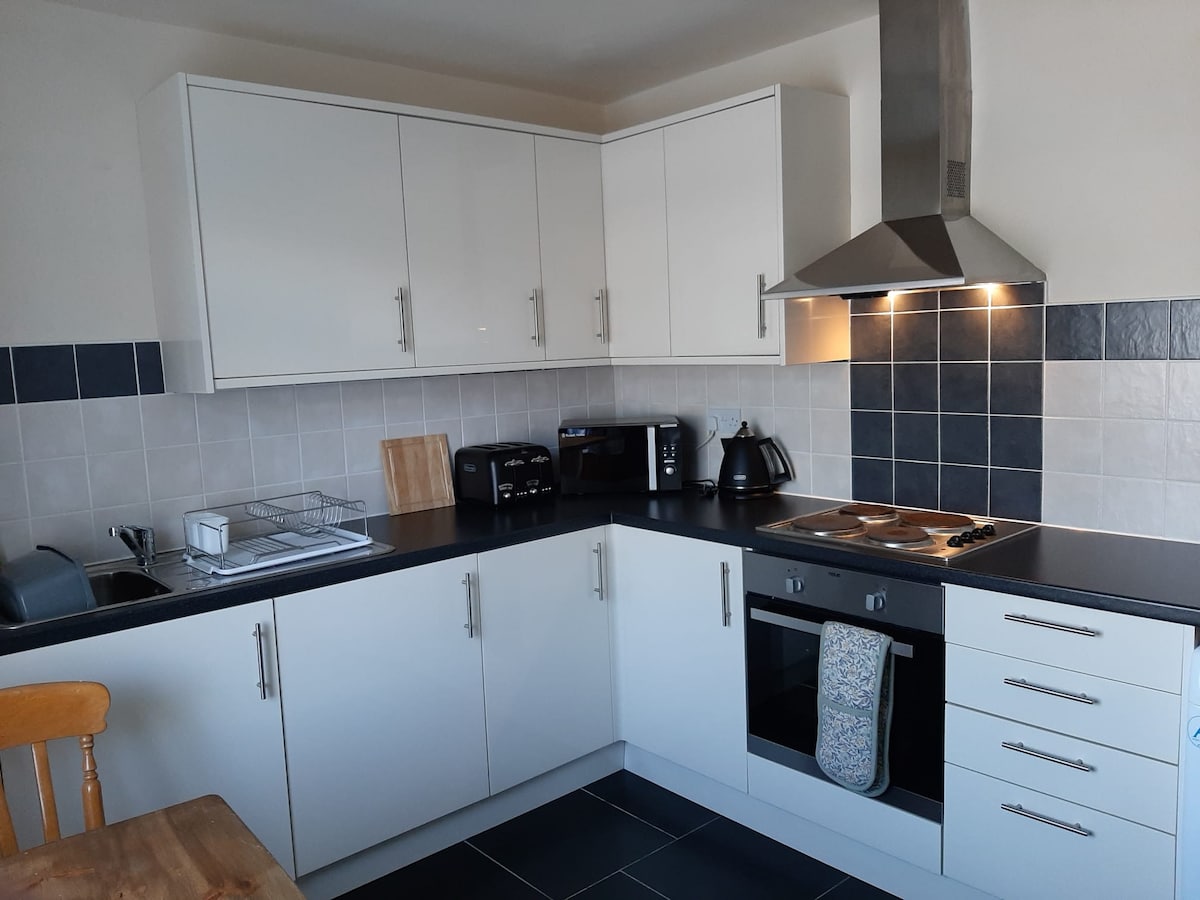 🍳 Cook at leisure in the self-catering kitchen, equipped with a hob, oven, microwave, full-sized fridge freezer, kettle, and dual air fryer—everything required for home-cooked meals.