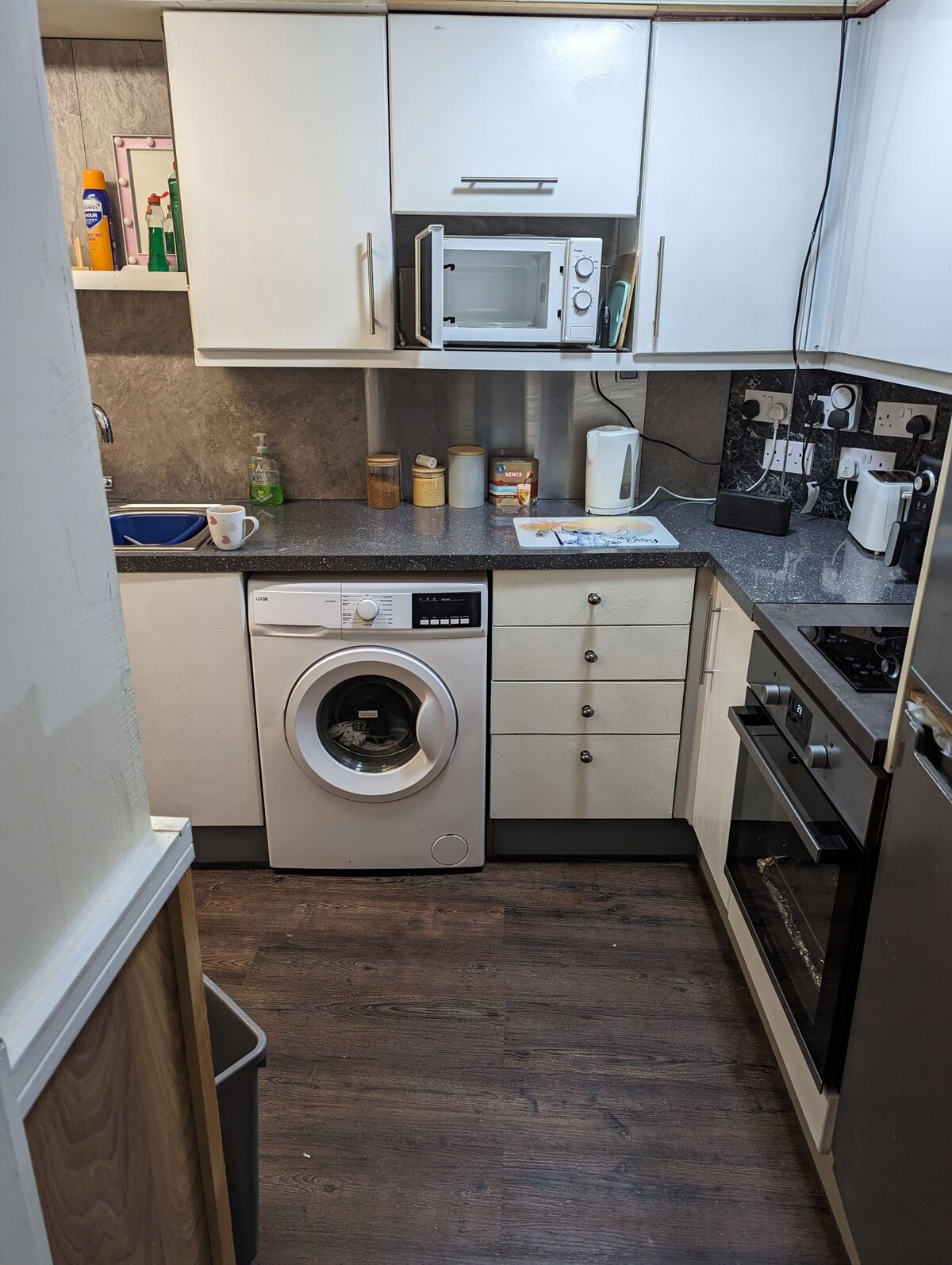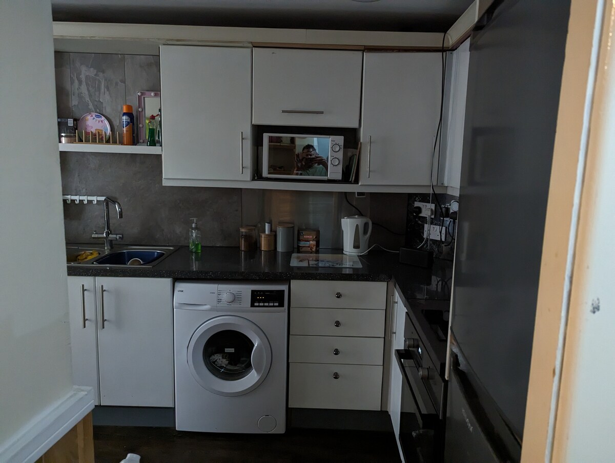Twin bedroom with shared kitchen/bathroom with washing and drying machine in Central Morecambe. Upon entry, there is a long set of stairs to a second set of stairs to the room.