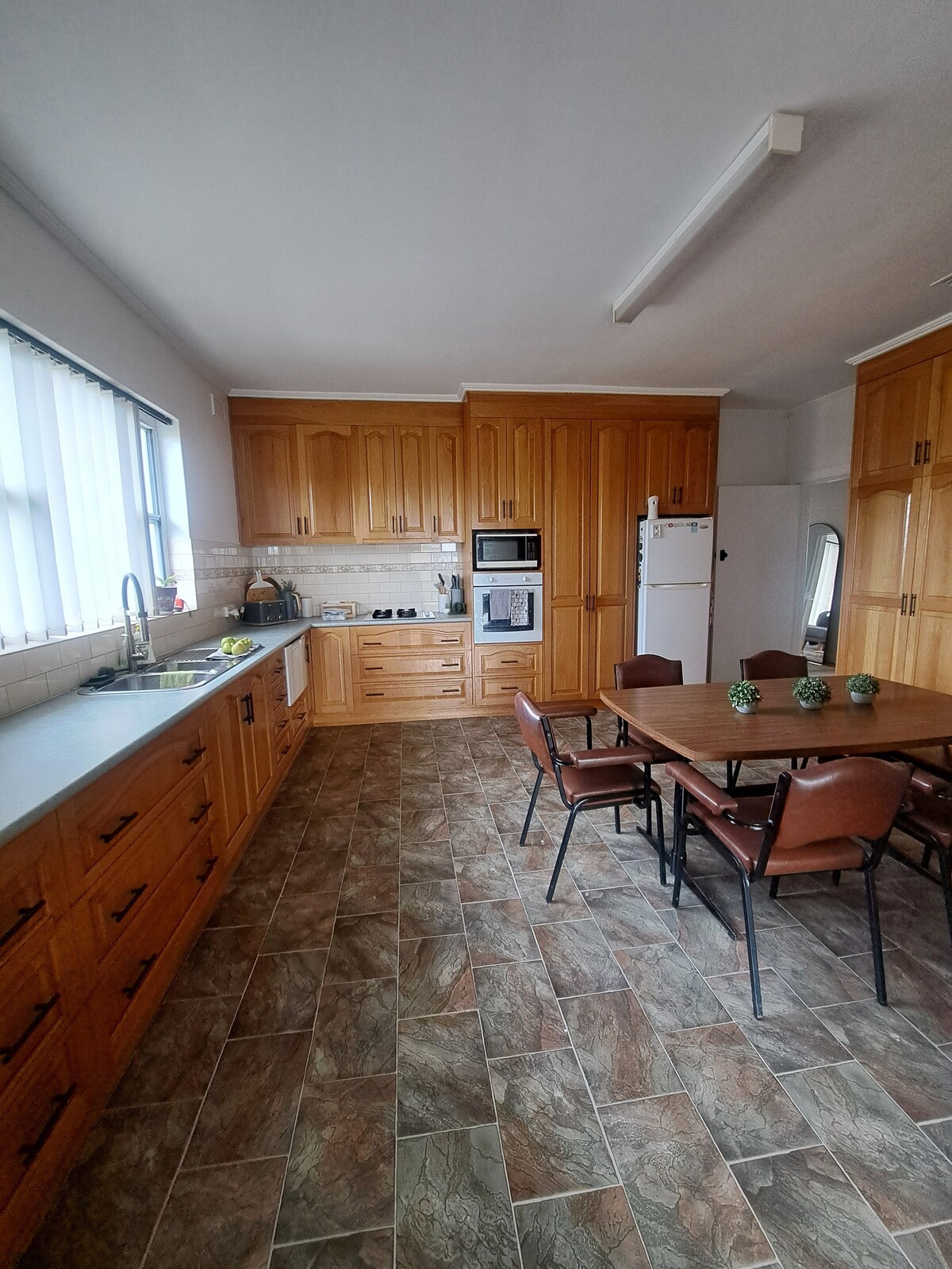 This newly renovated house has two large bedrooms, able to sleep up to seven people. We have in the first room a King size bed that can be split into 2 singles and also have another single bed with a trundle bed underneath that can be lifted up to a queen.