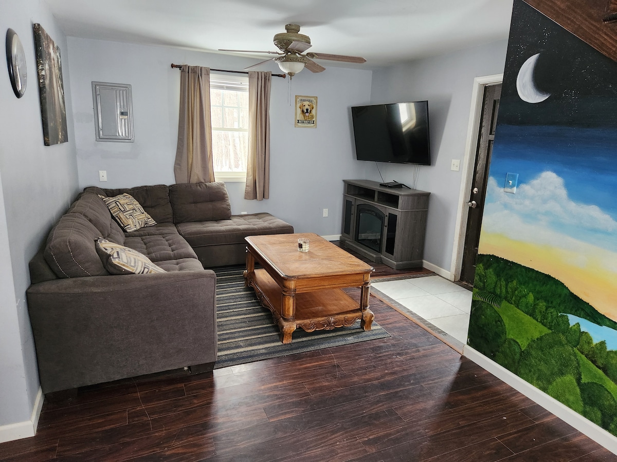 Large comfy reclining sofa and 2 single recliners in living room, wood burning stove , large screen tv with cable. Dining room overlooks a nine foot sliding door to deck with gas grill. Fire pit to toast your marshmallows.