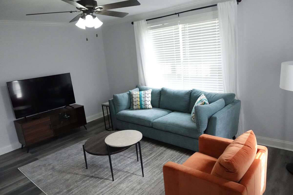 HOME HIGHLIGHTS: Flat-screen TV w/ Roku, dining table, gas fireplace, natural light, ceiling fans, backyard w/ bistro table