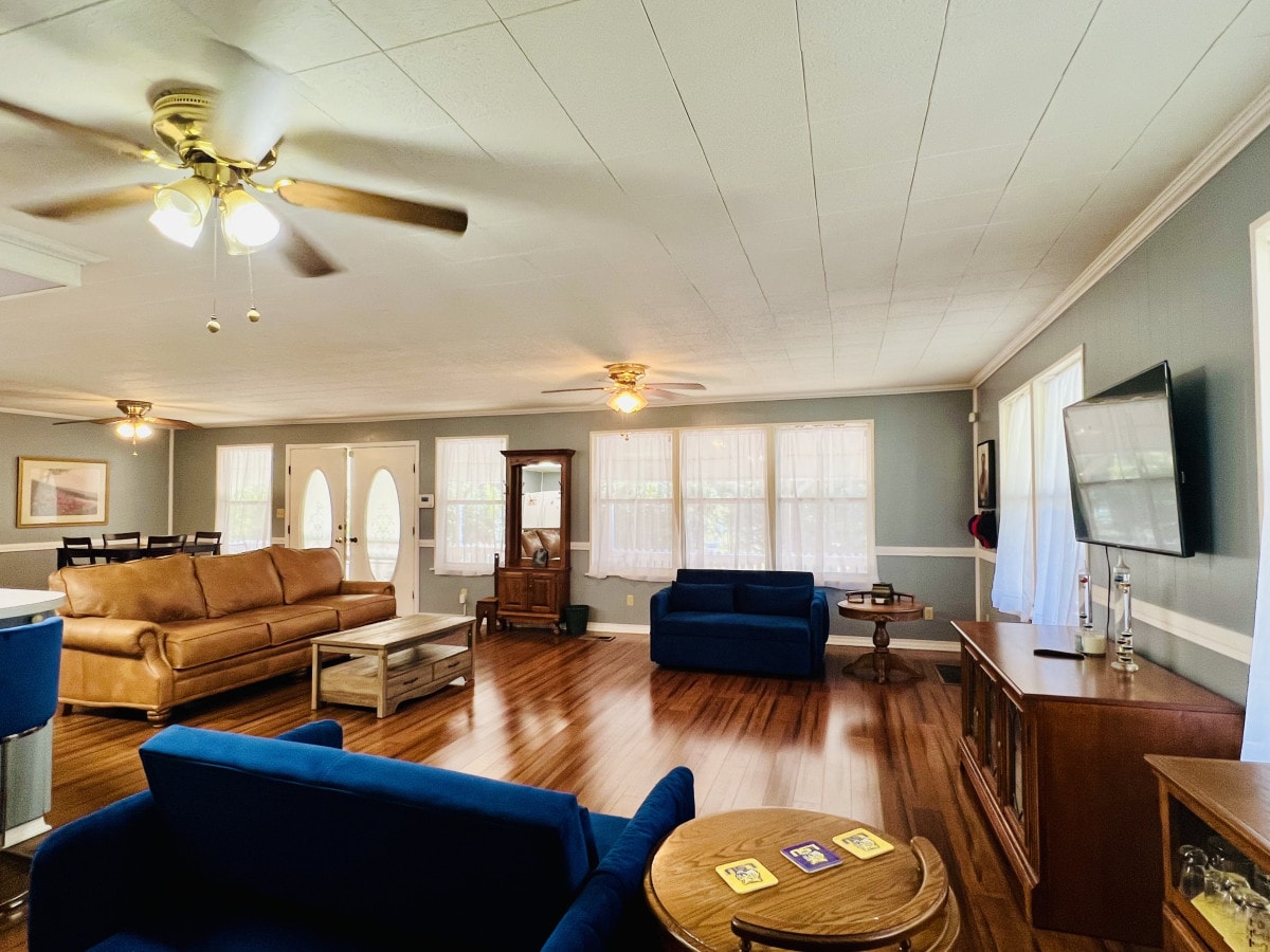 This charming lake house offers a large yard and ample parking for cars and boats, ensuring plenty of space for your entire group. The spacious, open living and kitchen area is perfect for relaxing and entertaining. The kitchen is fully equipped to accommodate large groups, featuring a gas stove and an open seating area, ideal for gathering and enjoying meals together.
