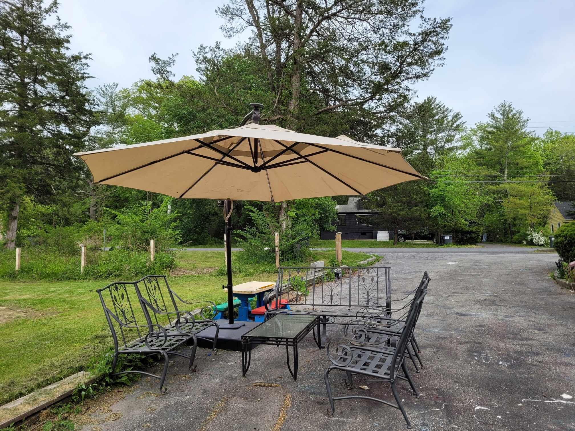 The backyard has a table with umbrella that is available to guests for outdoor use.