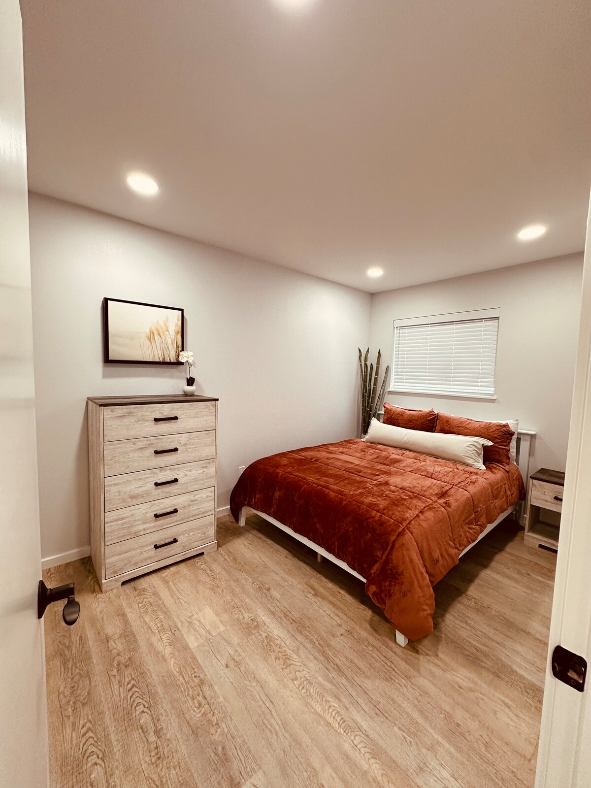 Queen Bedroom: The main bedroom features a luxurious queen-sized bed, ensuring a restful night's sleep. This room is not only a peaceful retreat with soft linens, comfortable pillows, and ample closet space for your belongings but also boasts a flat-screen TV for your private viewing pleasure. Whether you're winding down with your favorite show or starting the day with morning news, this personal entertainment touch adds an extra layer of comfort to your stay.