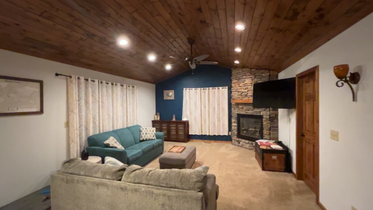 The custom design interior features 3 bathrooms, 4 bedrooms 3 king (with one that becomes twin beds) beds and a bunk-room with a day bed and trundle perfect for kids. A fully-stocked large kitchen with attached great room including a gas fireplace keeps everything and eveyone in one spot. The lodge also has a full laundry room, screened-in porch with a table and 8 chairs, and a large downstairs family room/game room with a foosball table. The kids can be downstairs while the adults have their private space. The outdoor area includes a large patio with a fire pit, 8 adirondack chairs, large gas grill, and a private driveway with plenty of parking.