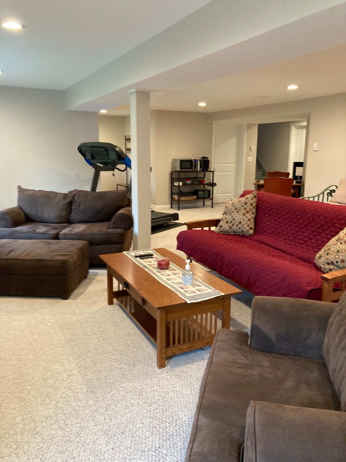 Two bedrooms with queen-sized beds and blackout shades on the windows. Ample closets and a dresser for storage. Recently renovated bathroom. Full kitchen with refrigerator, stove, microwave, dishwasher. Living/dining area with projector with Amazon Fire TV Stick for movie nights. For nights at home, the dining room table is a perfect spot for board games. Hardwood floors throughout and a tiled sunroom with a record player and records to enjoy. Also a bright space to get work done with wifi internet provided. Full basement with a washer, dryer, and folding table. Private driveway for off-street parking.