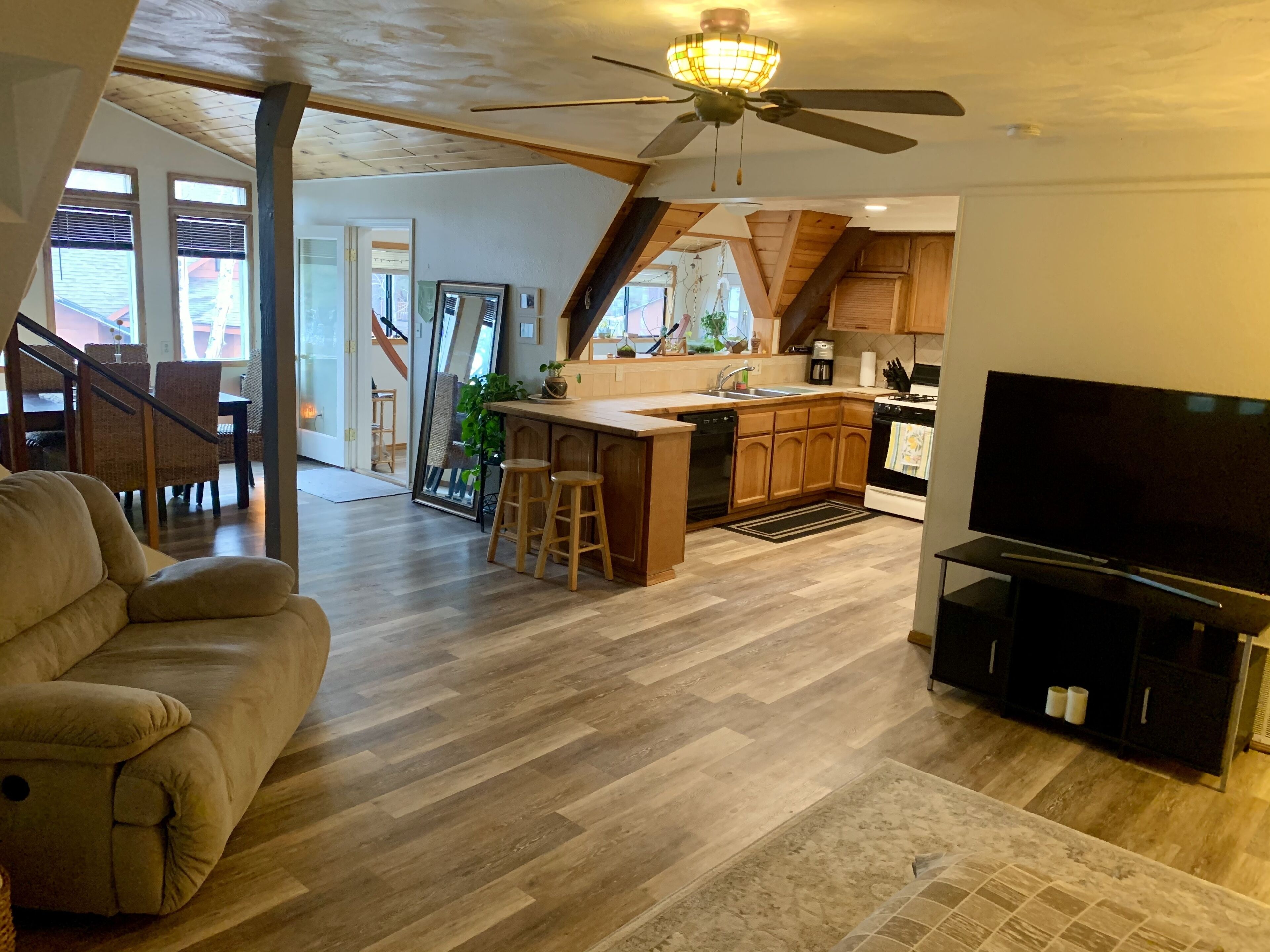 This includes a large square shaped table for your group to enjoy meals or games, the comfortable living room with a quality flatscreen TV and streaming options, a beautiful wood-burning stove, and the fully equipped kitchen (including dishes, pots and pans, French press, wok, air fryer, blender, griddle, hand mixer, crockpot, electric wine opener and so much more!