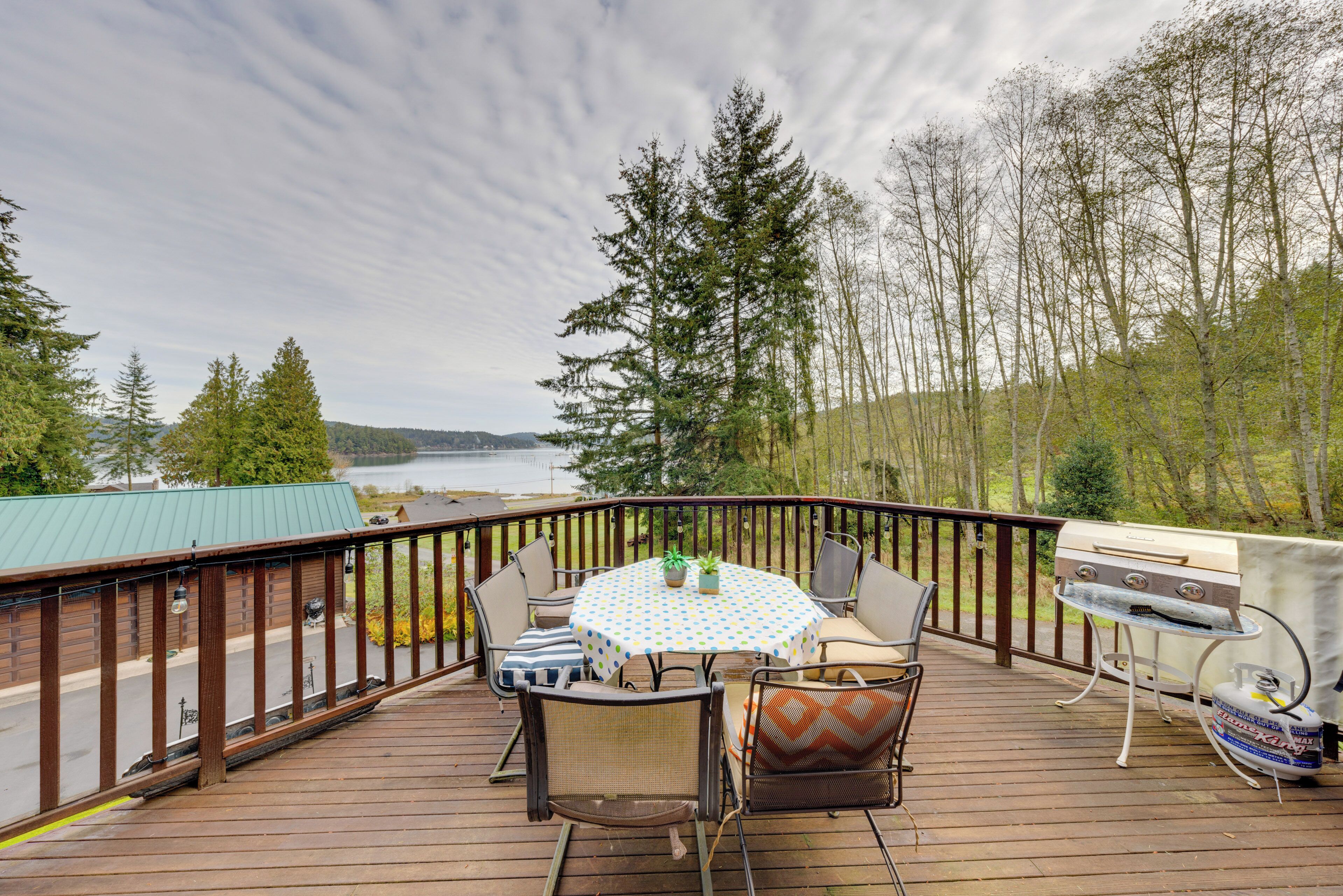 Uniquely located on a romantic setting with an idyllic running river/pond on back yard with views of the Bay backing the forest. Entry to east and west Deception Park Entrances. High end custom home. Sleeps 11. Magnificent views and short walk to Deception Pass park. Wraparound deck with table and BBQ to enjoy the bay views