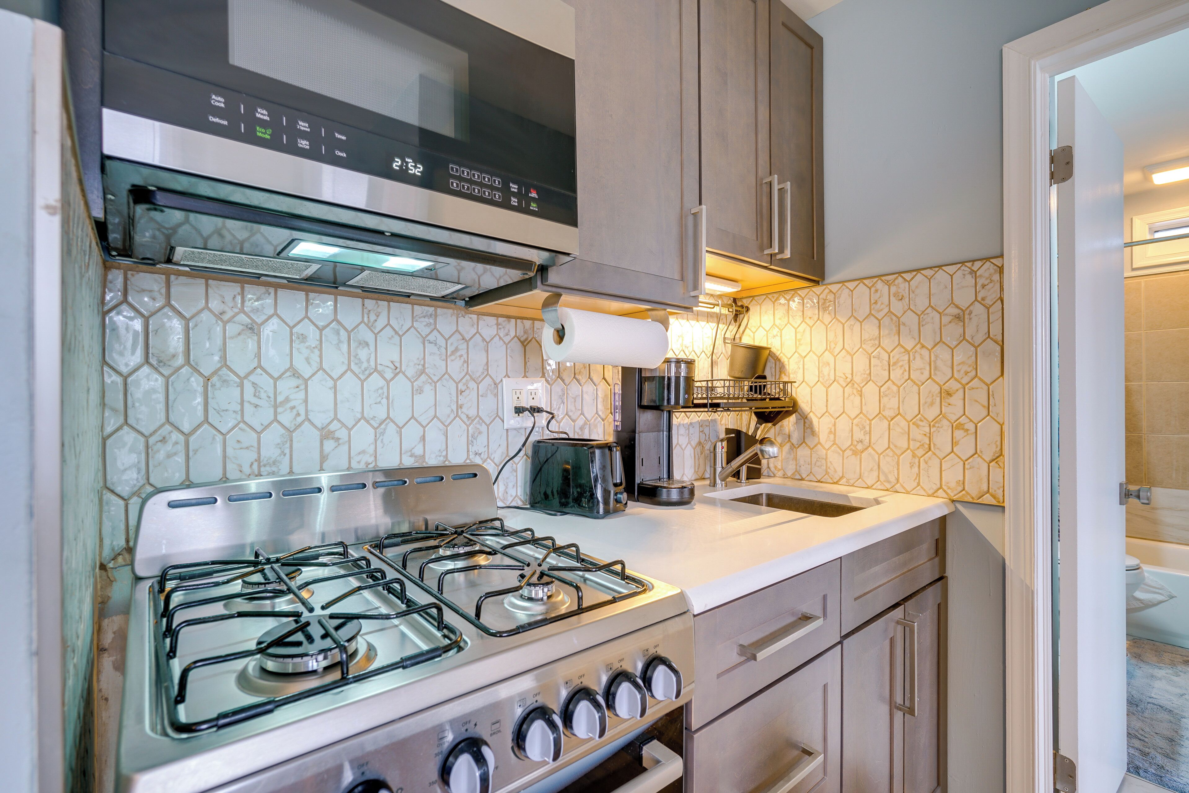 with the all the basics you'll need: microwave, toaster, refrigerator, dishes and silverware, Keurig coffee maker, and stovetop with pan and skillet.