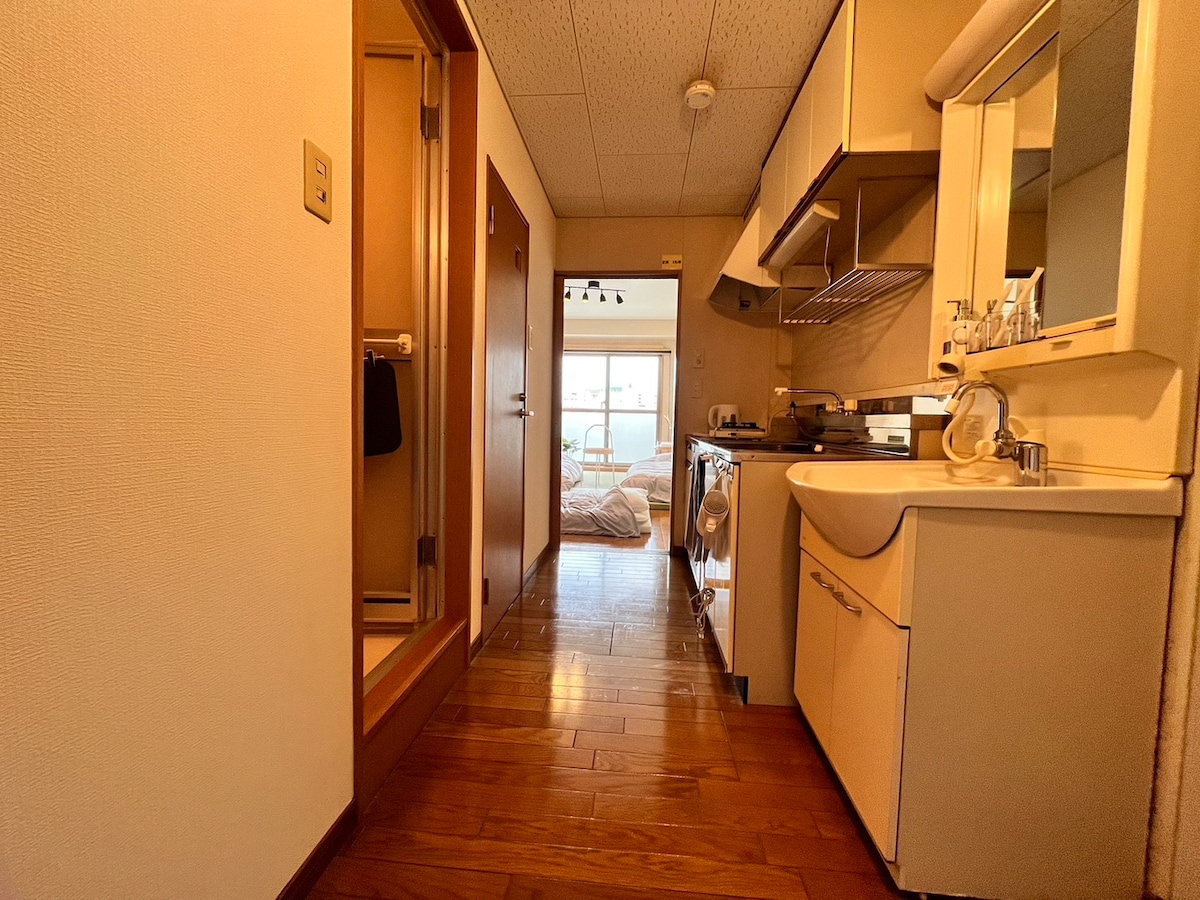 This is an entire single unit bungalow rental. There are 3 Japanese-style rooms (tatami mats and fusuma sliding doors). The bath is small, but there is both a bathtub and a shower. There is no washroom, so there is a mirror installed at the kitchen sink.