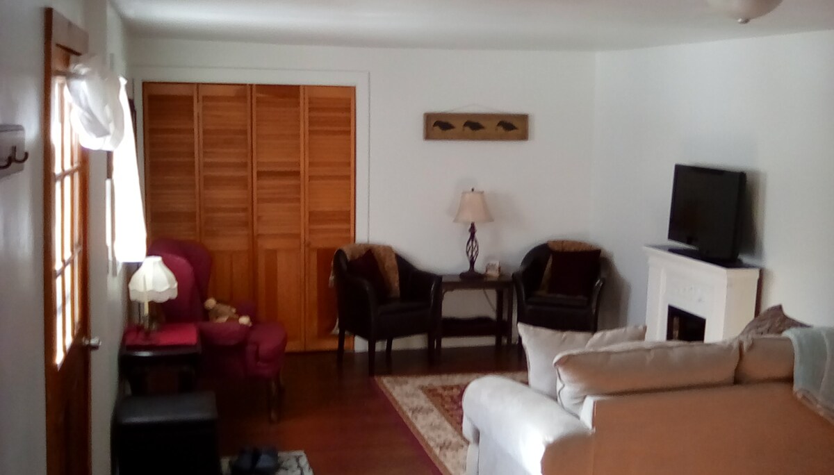 Your private space is the newer, rear part of a 130-year old house near the village center. The wide deck where you enter is mainly your private space as well. The large kitchen has an electric range and oven, and an over the counter microwave. The door on the left side of the kitchen opens on the laundry room and can be locked from your side. You may use the washer and dryer in the laundry room, which is a shared space. Your private bathroom has a separate shower and toilet.