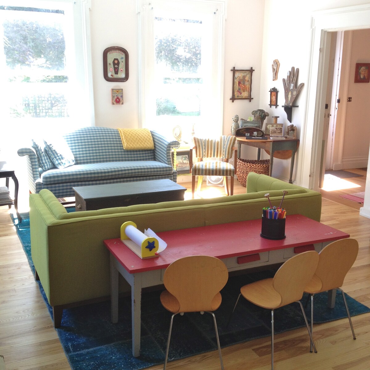 Shared kitchen, use the fridge, stove. Provide your own food/beverages. Do your own dishes by hand. Guest rooms are upstairs. Use of the small backyard.
