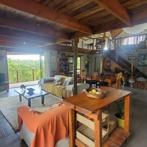 The house is spread over two levels, offering both comfort and stunning views. The upper level features a spacious veranda with breathtaking views of the ocean and the Slang River valley. It includes a large dining table, perfect for enjoying festive meals while taking in the scenery. The rest of the upper level is an open-plan space with a lounge, dining, and kitchen area. The lounge area has a small indoor fireplace.