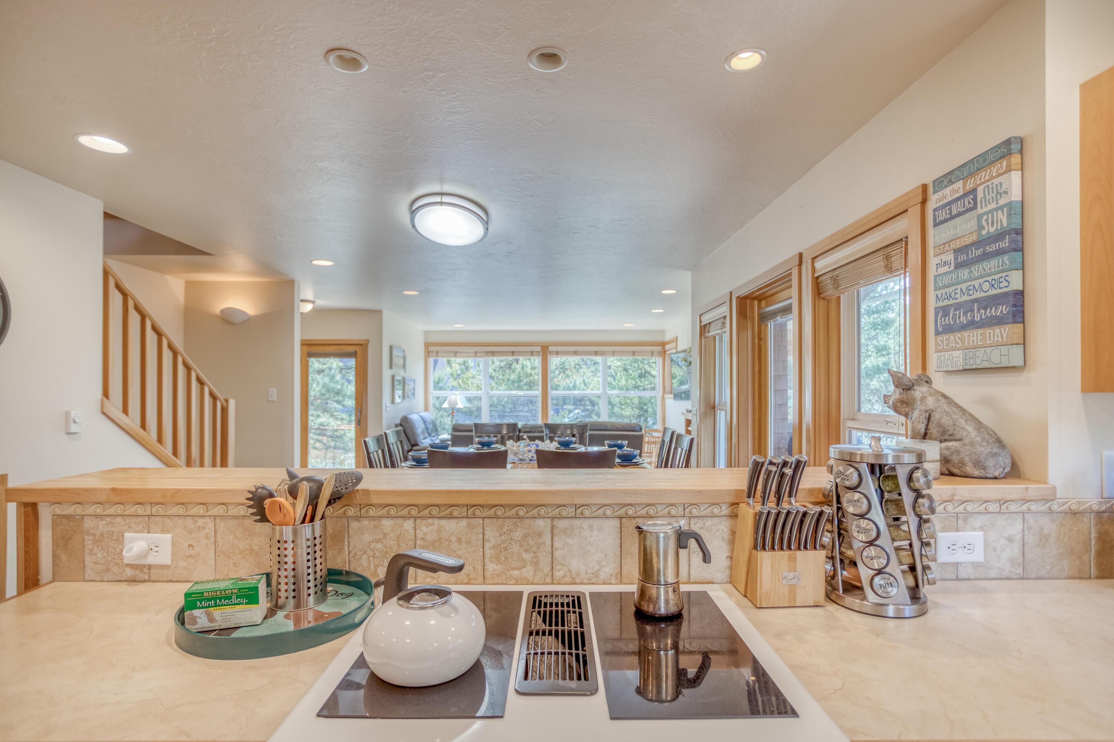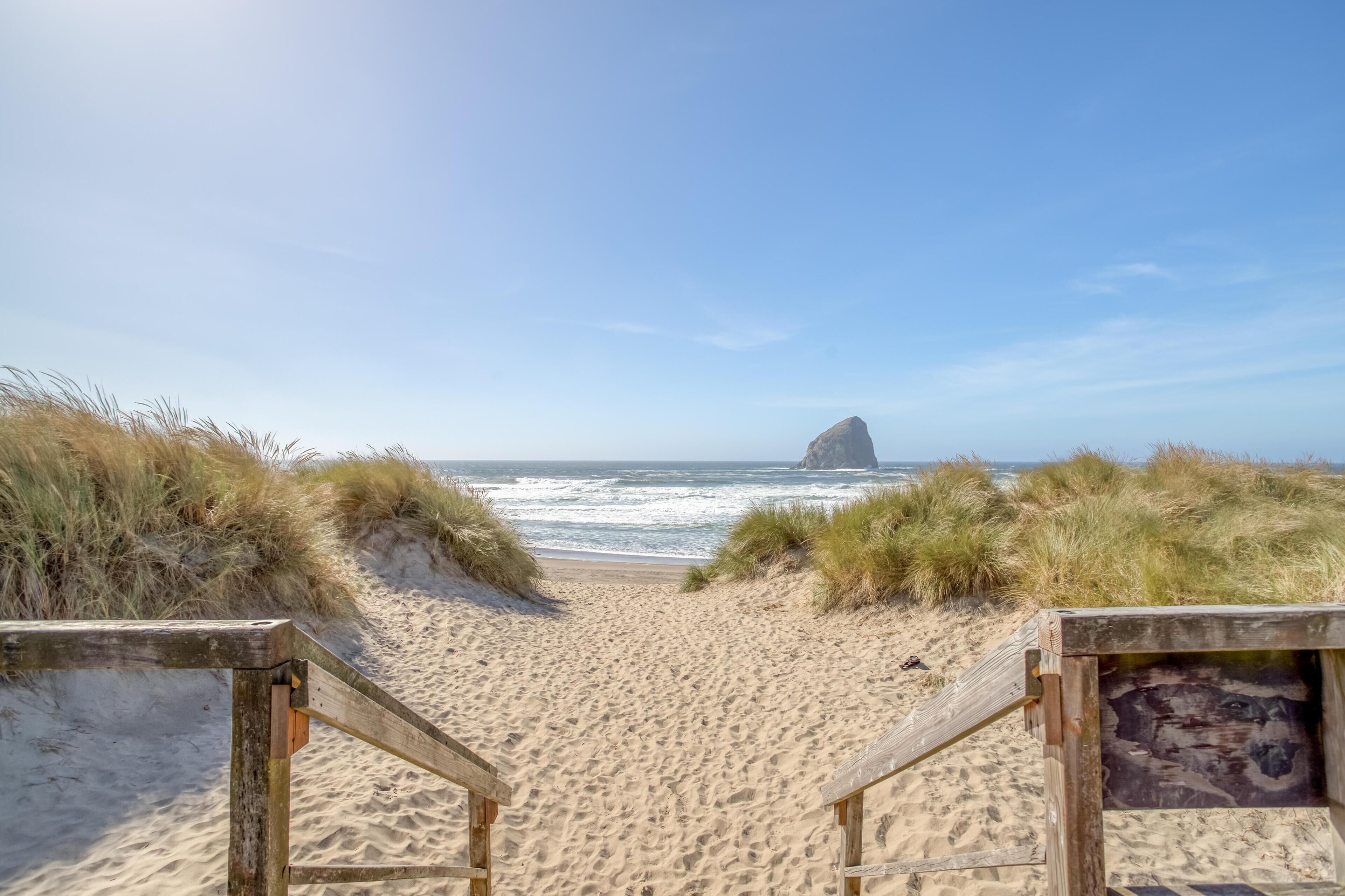 Snuggled in beach grass and shaded by shore pines, King Tide Pacific City is a modern, thoughtfully appointed and cozy home near Cape Kiwanda in Pacific City. With a back patio and barbecue, you’re equipped to eat outdoors and enjoy the sun and ocean breeze in a quiet neighborhood a short walk to the beach. Indoors, a high vaulted ceiling and skylight make the great room feel spacious. Comfy sofas, a large flat-screen TV (streaming Only), a gas fireplace, and a pretty staircase will make you feel right at home. Tile flooring graces the fully equipped kitchen, with its stainless-steel appliances and quartz countertops, bringing elegance and everything you’ll need to cook for your guests. Two bedrooms on the main level and a room upstairs provide plenty of space for a larger family or extra friends sharing vacation time. You can walk out your door to pathways over the dune to fantastic views of Haystack Rock; stroll up the beach to enjoy a beer at the Pelican Pub, inspect tide pools, climb a dune or just people-watch on this beautiful and popular stretch of coast. You’re well placed for exploratiing Tillamook, and the North Oregon Coast, or Lincoln City and Newport to the south. King Tide Pacific City assures you an updated, quiet space to return in the evenings for rejuvenating sleep for another day of coastal adventure!