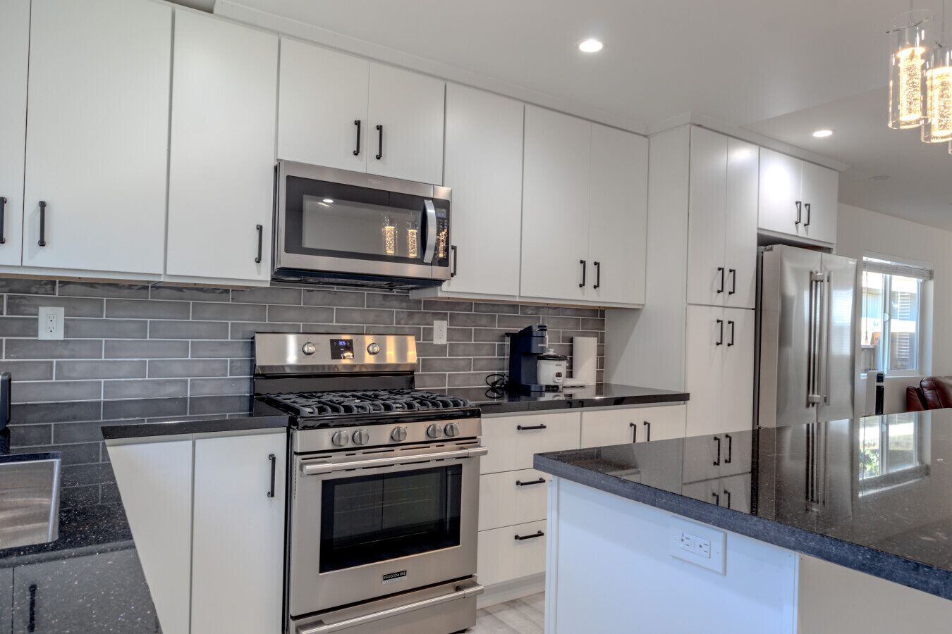 The full kitchen includes granite counters, premium cabinets and modern appliances: range, oven, microwave, dishwasher, disposal and full refrigerator/freezer with ice-maker and filtered water. Villeroy & Botch china set for eight, glassware, cups, silverware, pots, pans and utensils are available. There's plenty of counter prep space. There's a bar-top/dining table with six stools.