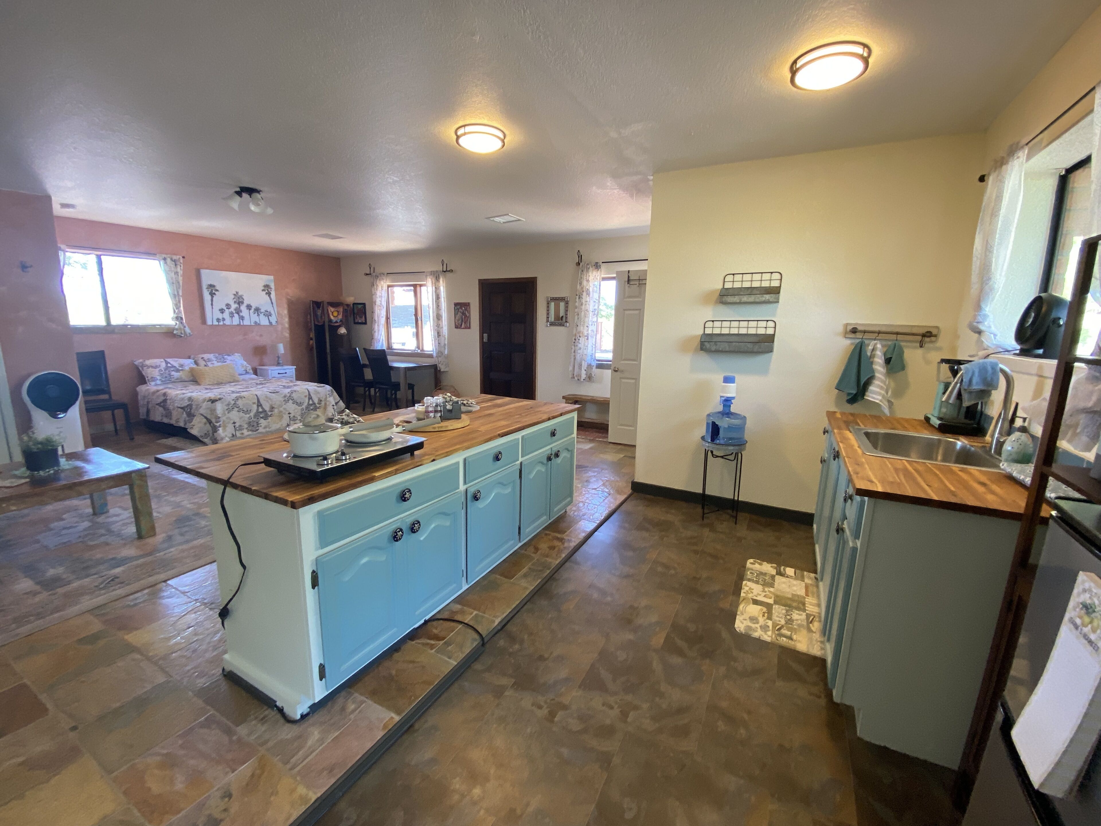 KITCHENETTE: Mini fridge, toaster oven, drip coffee maker, blender, stovetop