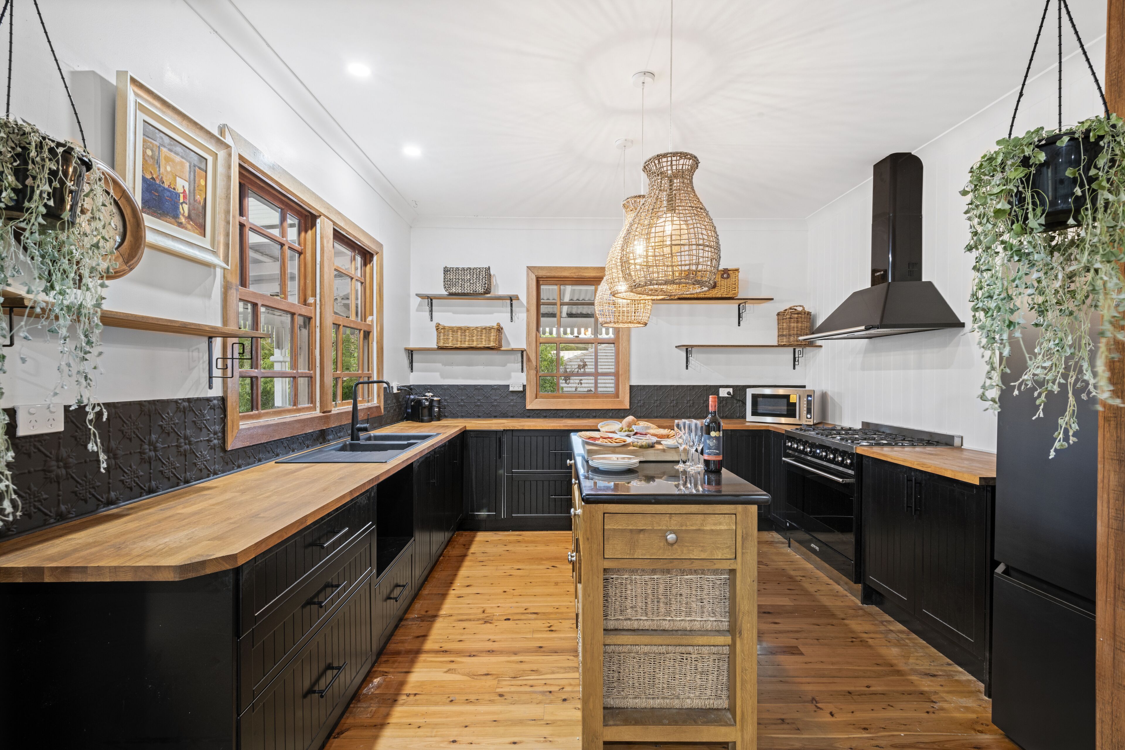 Character filled timeless kitchen with all of the newest features including chefs oven with six burner gas cooktop, island bench, on trend matte black sink and tapware and gorgeous original timber windows overlooking the surrounding greenery.