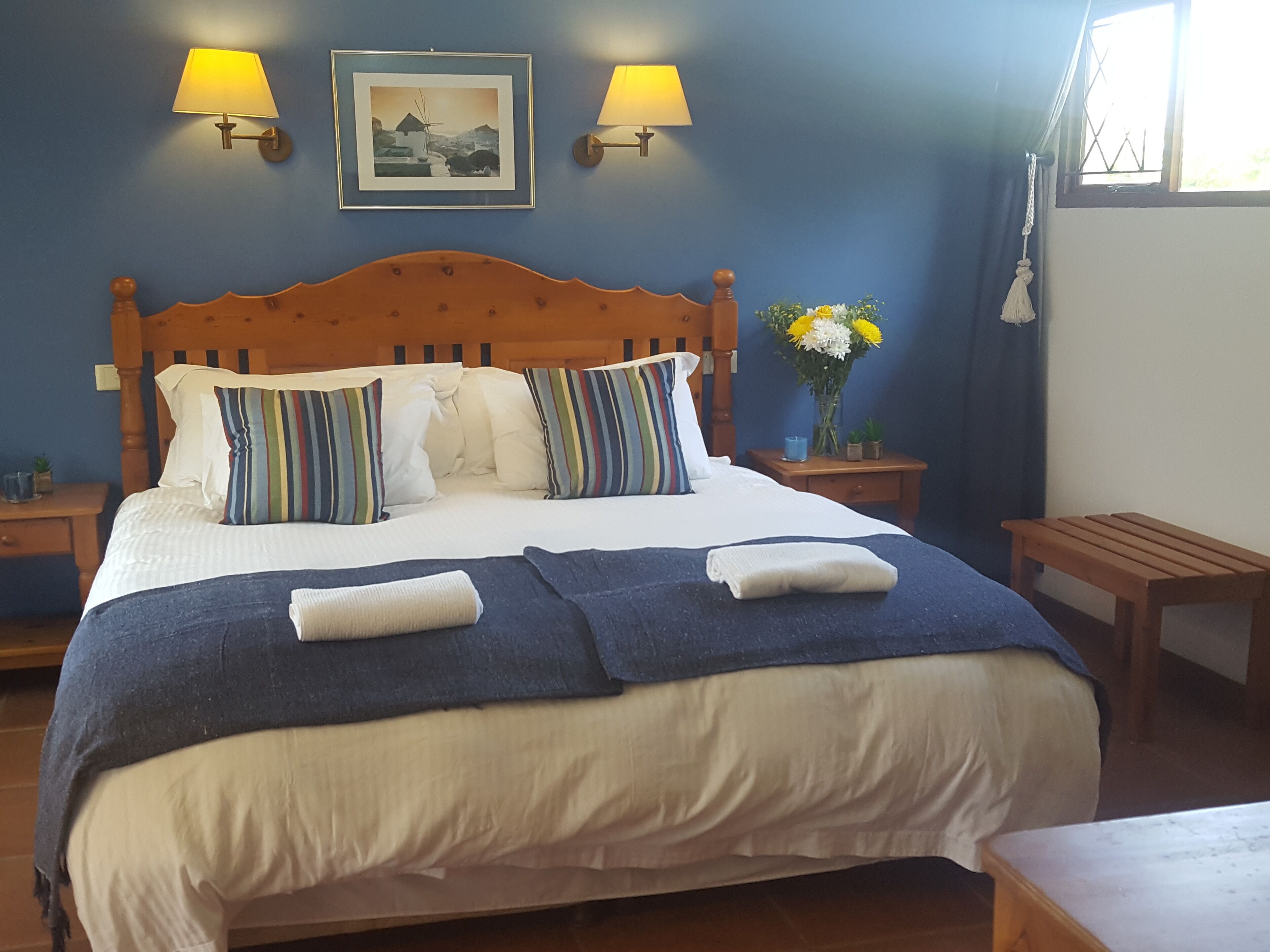 The cottage has 2 bedrooms situated on either side of the open-planned living room. Both bedrooms have a king-sized bed made of 2 single beds. Therefore guests can choose to sleep either 1, 2, 3 or 4 people in different configurations. The master bedroom and is en-suite to a large shower which is partially disable-friendly. (The bedroom door width is 700mm and the basin is normal height). The 2nd bedroom is shaped as a rondawel and is also en suite. The living area is well appointed and comfortable. A small verandah leads off the dining area and has blinds for privacy or to allay the effects of the winds and rains. A conservatory leads off the master bedroom in which is a couch and piano where you can exercise your fingers.