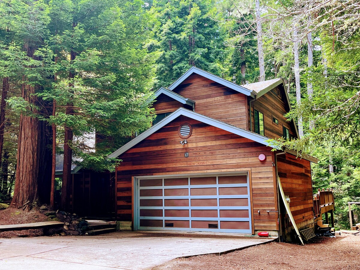 Escape with your family to our secluded cabin, nestled in a private neighborhood in the redwoods. Get the best of both worlds with a protected redwood forest for a backyard and a quick seven miles to the beach. Beachcomb and boogie board by day, and enjoy the redwoods by night while roasting marshmallows at the fire pit on the large deck. Play pool, games, toys in the playroom, or watch a movie by the cozy fireplace. Work in the private office or relax in the sauna and freestanding tub.