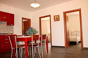 The two-room apartment is located on a mezzanine floor. It is composed of a double bedroom with an external balcony, complete with bedside tables and a large wardrobe, air conditioning and a lockable door; a living room with kitchenette, fridge, color TV and single or bunk bed on one side; internal bathroom with hot shower. The unit is complete with dishes, cutlery, cookware, tableware, bathroom and bed linen.