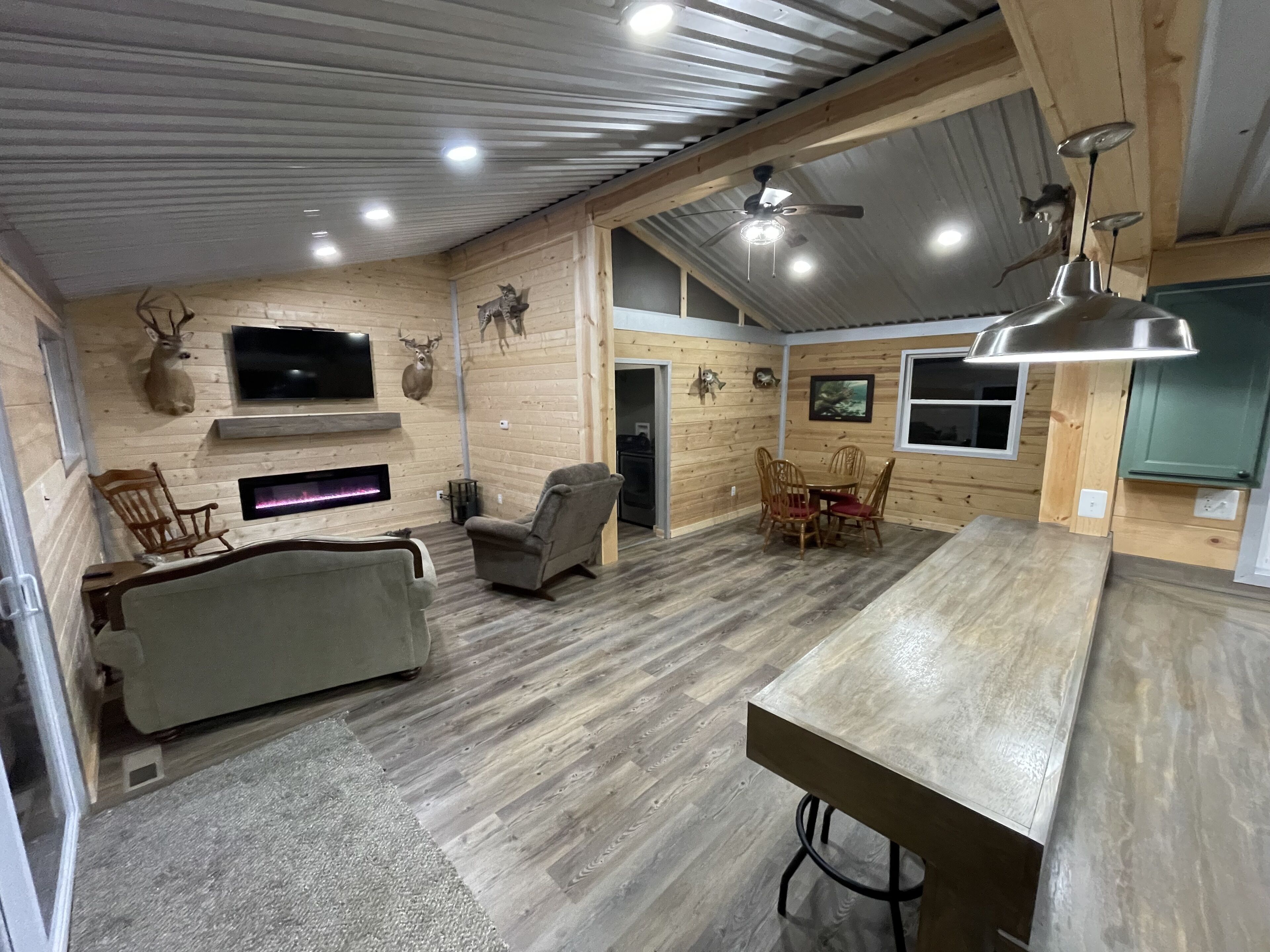 The small "great" room has 2 sliding windows for a great view of the lake, with a fireplace, sofa, and recliner. A large dining room table and kitchen compliment the rest of the room with the bath, laundry, and bedroom door leading off of that.