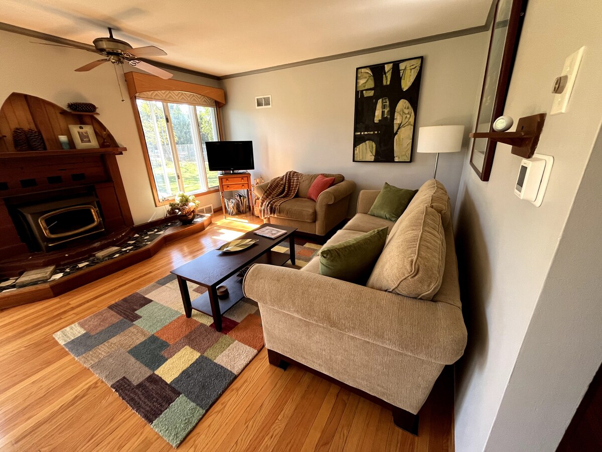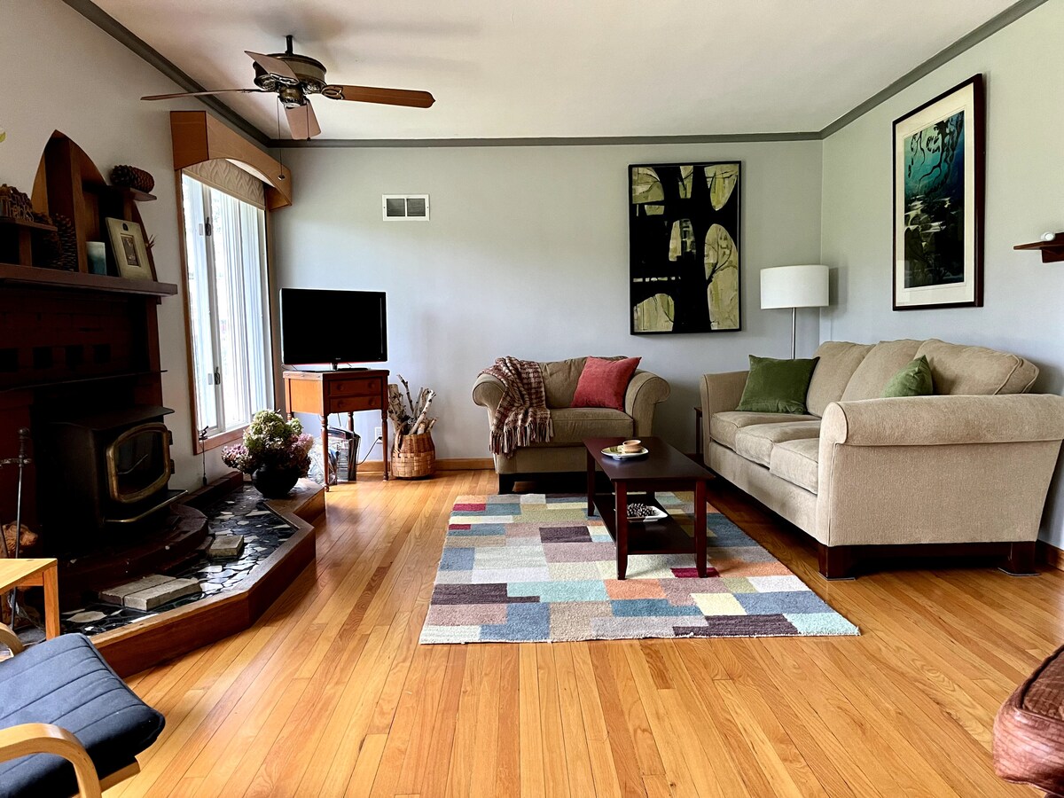 The fireplace, vaulted ceilings, and large bay window with Sunset Views over the water makes this a perfect cozy Getaway for you and your family!