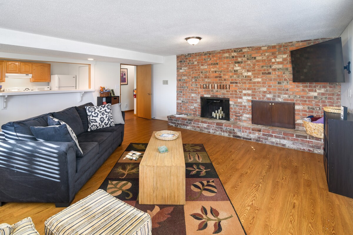 This apartment features a cozy living room to put your feet and watch t.v. The couch is a hide-a-bed and can sleep 2 extras comfortably.