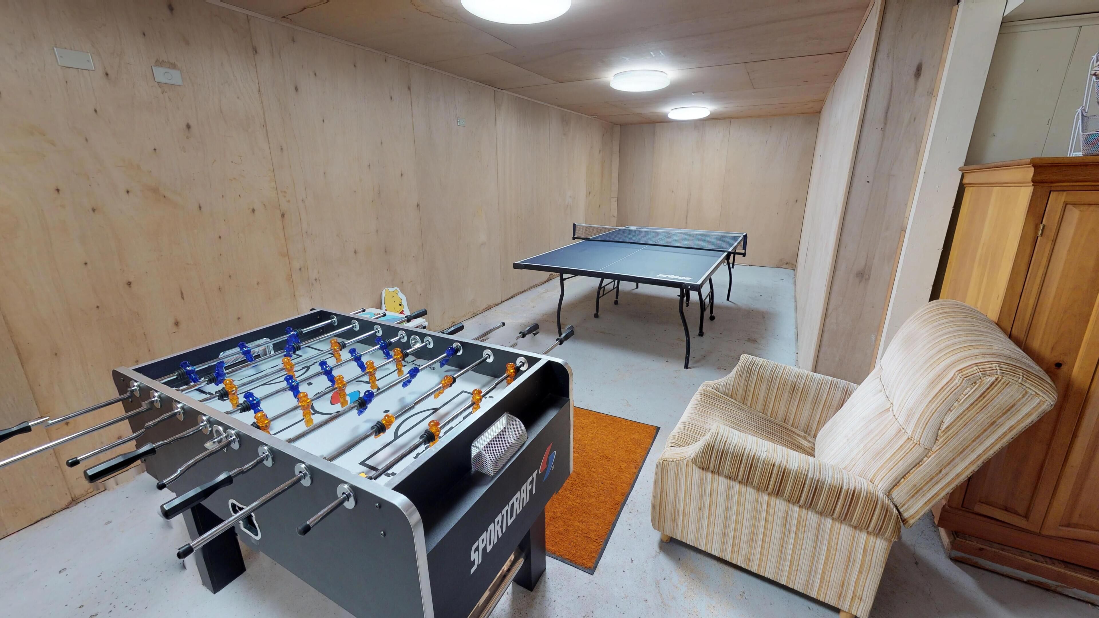 Glow in the dark '80s-themed game room/garage with a space heater. Remember to turn off the space heater when not in use. The game room includes a poker table with chips, Foosball, putt-putt golf, an Arcade game (Pacman/Galaga), Wii, hoops, darts, cornhole, ring toss, tic tac toe game, clamming tubes, sand castle toys, and kites. Board games are available inside the main house. We provide a garage, beach chairs, and tables for your convenience. Please avoid bringing glass beverages into the garage, and kindly refrain from smoking. Also, please keep drinks off the Foosball, arcade, and poker tables. Lastly, please use only metal or plastic objects in the game room.