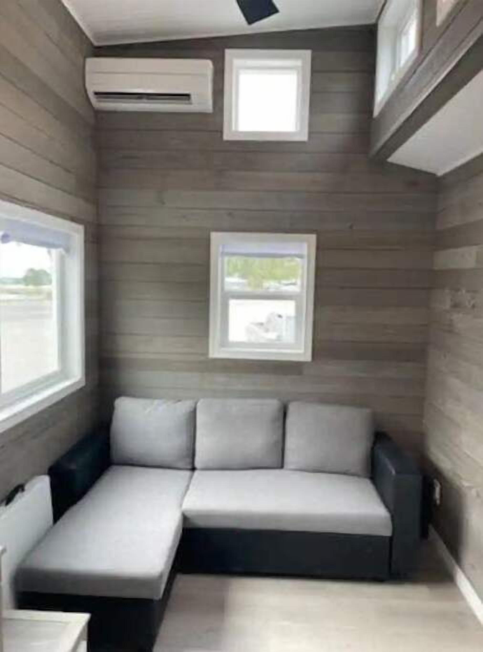 This Tiny Home has a queen size bed in the loft and full size sofa couch on the main floor. There is a TV in main living area with HDMI cable for laptop/computer. There is a microwave/convection oven, cooktop, and refrigerator. A small dining table with two chairs. The home is heated and cooled with a mini-split.