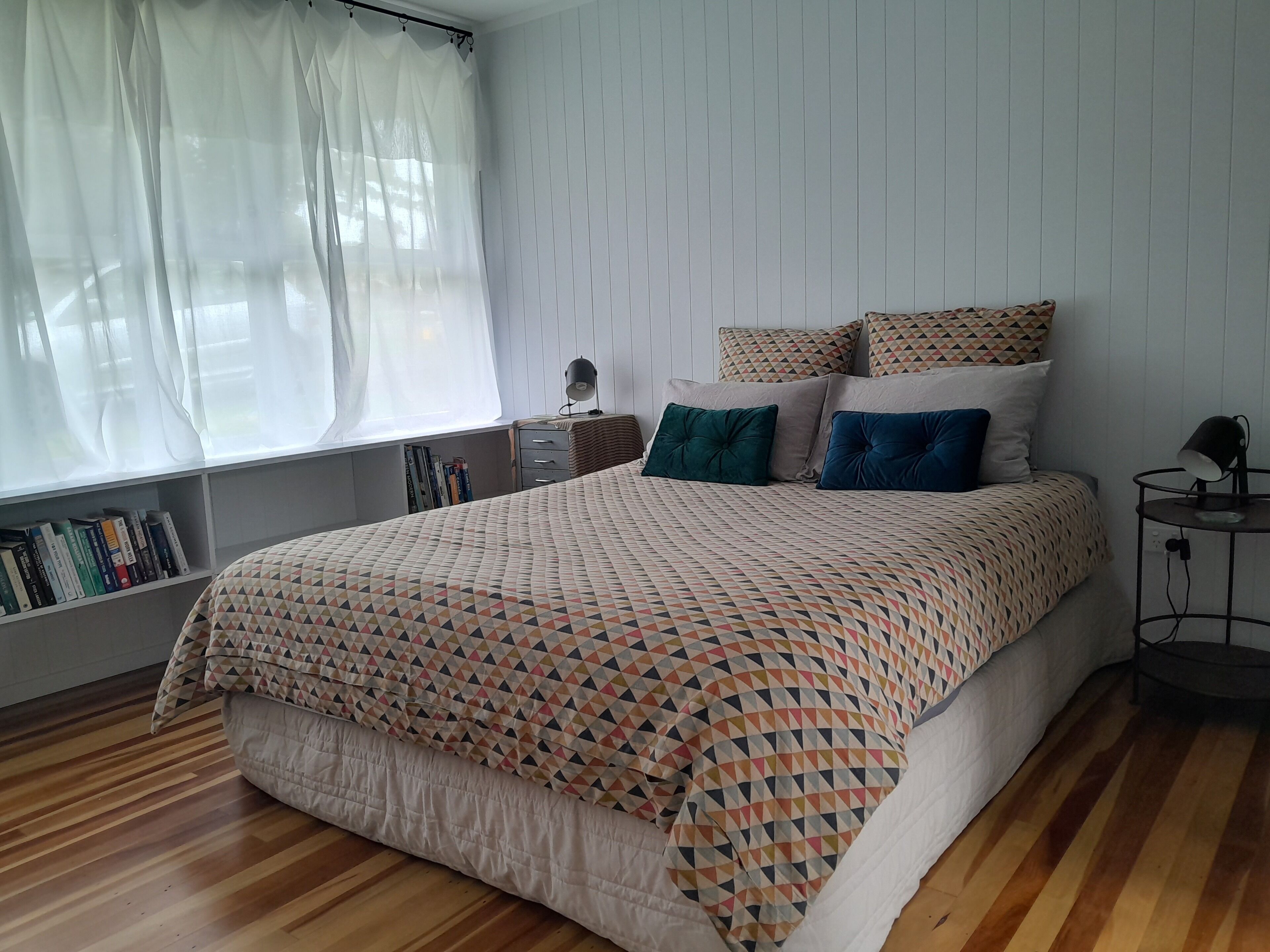In the room there is a queen bed, a desk and drawers and shelves. The room is seperate from the main house. There are basic kitchenette facilities - a kettle, toaster, microwave, dishes and fridge, and we provide tea and coffee so you can prepare the essentials before you go!