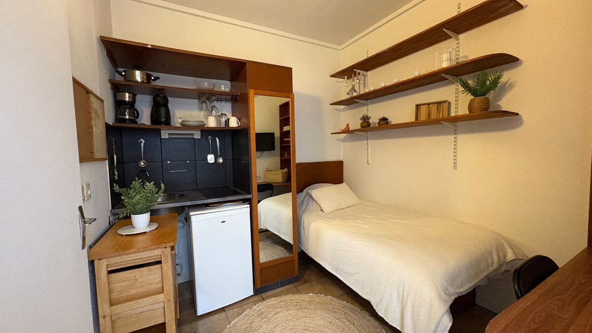 Located on the 1st floor of a quiet residence, the 30m2 studio includes an equipped kitchen area (combi oven, induction hobs, fridge with preservative), coffee and tea available, Nespresso coffee machine, kettle and toaster. Dining area. Living room with fixed sofa, library, TV, free wifi, radio.