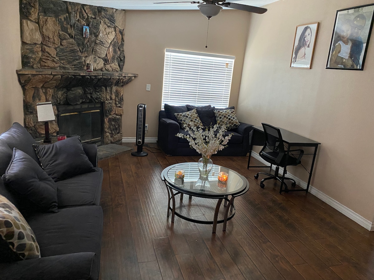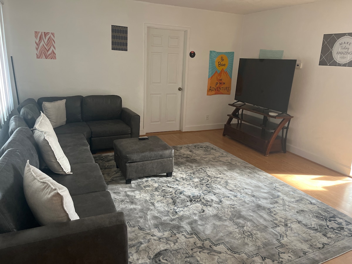This space comes with a smart TV, full kitchen appliances and set. Queen size bed with coffee table, closet and drawer. Garage and patio included with the space. (sedan recommended)