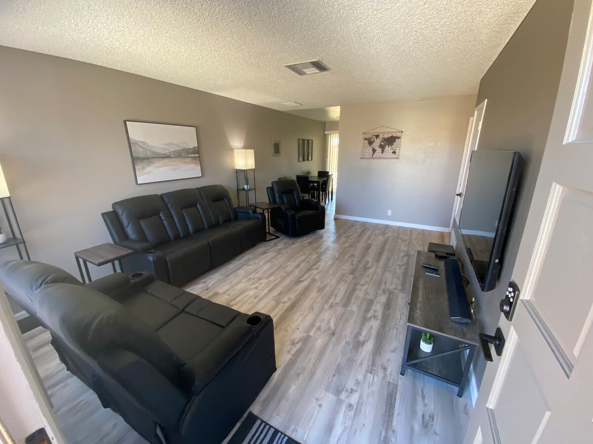 Newly renovated apartments in the heart of Ridgecrest. All new stainless appliances, granite countertops, luxury flooring. Gigabit high speed internet, wifi 6 router. Two bedroom, 1 bath, 1 story on the ground floor. Rental comes with 2 spaces in attached parking lot. Corner unit, so you only share 1 wall with another unit. 2 miles from South Gate of China Lake Base, 2.5 mi. from Main Gate, 2 mi. from Hospital, 1 mi. from grocery store, 1 mi. from Walmart. Perfect location in a brand new space!