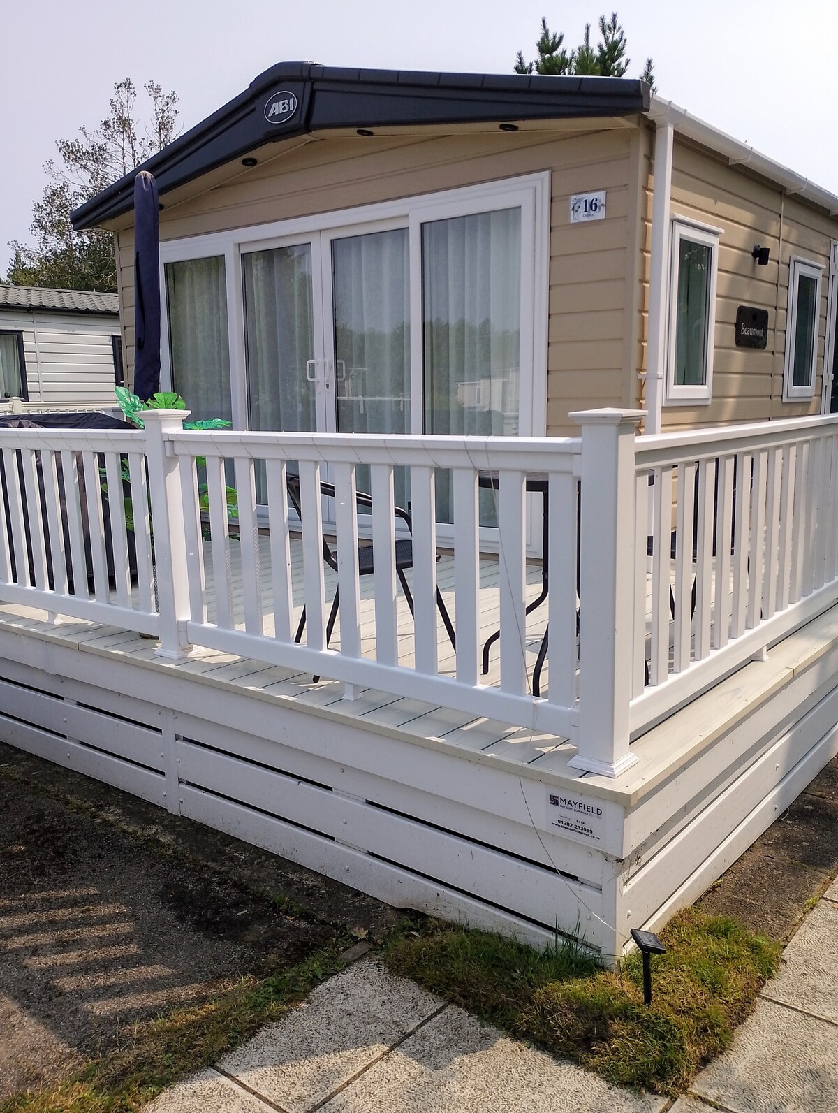 Outside the gated deck has a table with chairs, a parasol is also available if needed. The designated parking space is in front of the caravan and can fit two smaller cars or one large car.
