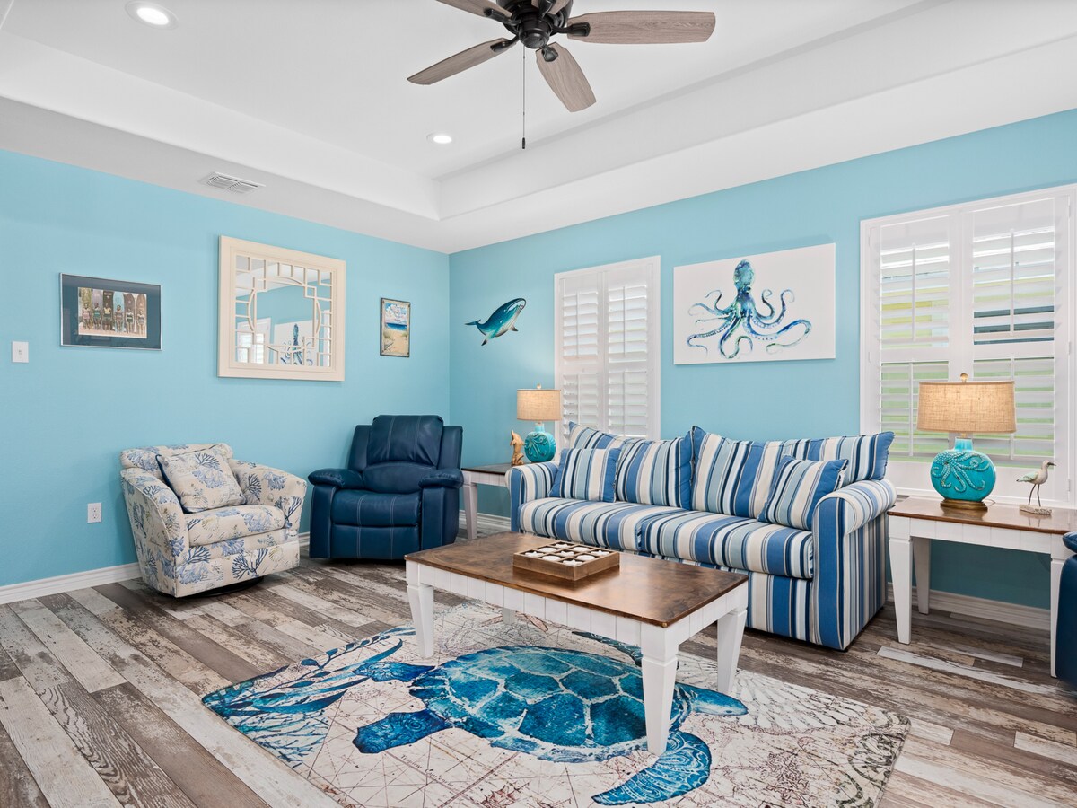 Retreat inside the Sand Piper for coastal living. Sink into the cozy living room furnishings and watch your favorite Netflix show on the Smart TV. Grab a quick snack from the fully equipped kitchen, where you can find stainless steel appliances and cookware. When ready for a good night’s sleep, snuggle into fresh linens and fluffy pillows.
