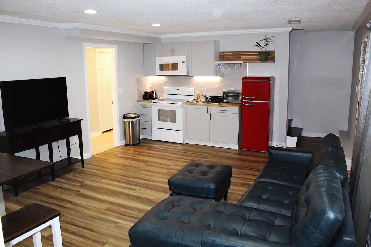 Cute and spacious one bedroom basement apartment with private entrance in a family neighborhood home. LVP floors throughout, a kitchenette with a mini-refrigerator, microwave and coffee machine (not a full kitchen) A bedroom with a queen and twin bed, and to top it all, it features a projector in the living room. A deck with a firepit table and 4 chairs with a view to a beautiful creek.