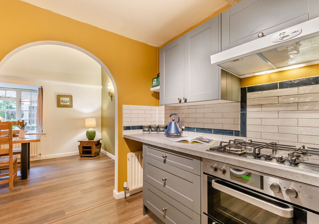 There is a large comfortable bottle green velvet sofa bed in the lounge, with additional arm chair creating a cosy hub around the smart TV.. For our guests needing to work, we have hung a folding desk on the wall behind the door with a chair, ideal for those needing to crack on but out of sight for a relaxing evening. The grey high-spec fitted kitchen includes: integrated double oven with induction hob, integrated washer dryer and fridge freezer. There's a spacious dining table for four by the French doors to the garden.