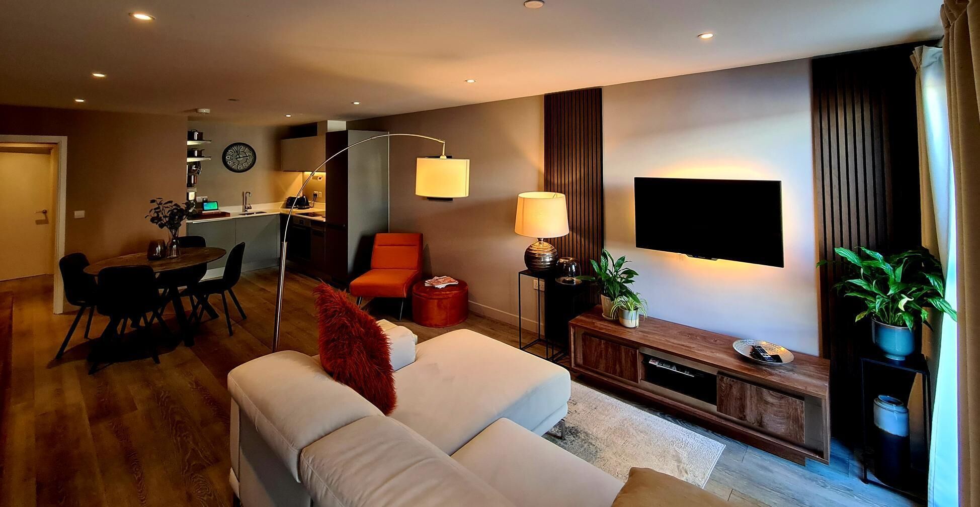 Kick back, and relax, in this new stylish 1-bed apartment flat. Consisting of a bedroom with a King Size bed, 1 shower room, and a large open plan kitchen living area. There are no shared areas, this is for full access.