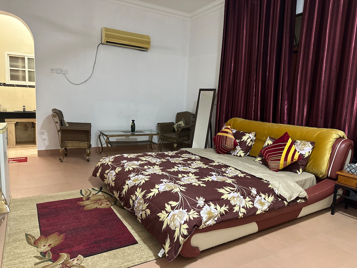 Stay comfortably in Salalah at this 4-bedroom villa. This adorable property offers a charming and enchanting atmosphere for guests to enjoy. With 1 king bed, 2 twin beds, and 1 queen bed, there is plenty of space for everyone to relax and unwind. The villa features all the necessary amenities to ensure a wonderful stay, including AC for your comfort. Whether you're planning a long vacation or a short getaway, our place is equipped to make your holiday one to remember. Book now and experience the magic of Salalah at this delightful villa.