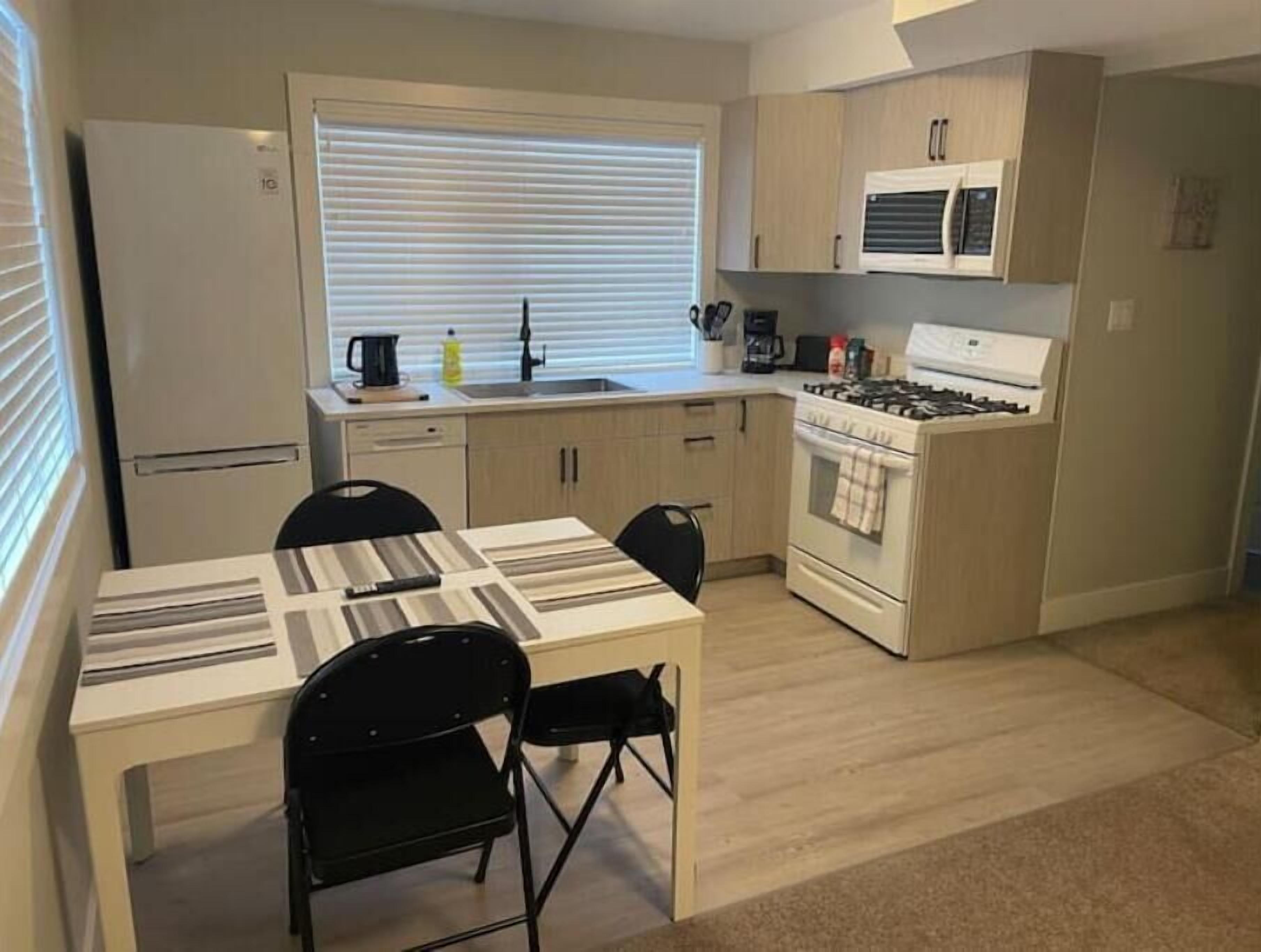 Full kitchen with a bartop kitchen island—perfect for hosting and gathering. Stocked with appliances, cookware, coffee, and essentials.