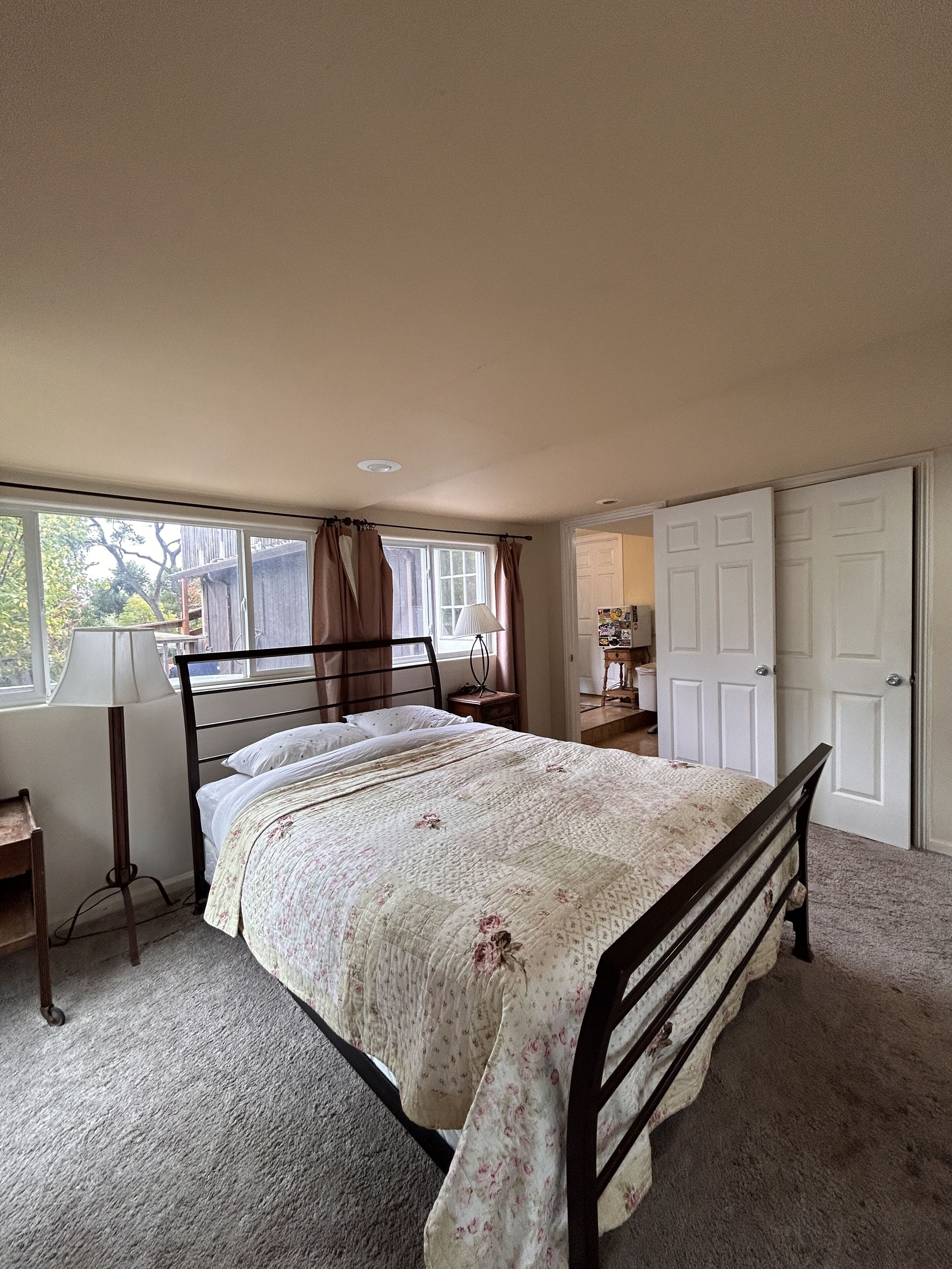 The guest house is a completely detached, private residence thoughtfully designed for comfort, privacy, and serenity. Inside, a generously sized bedroom features both a queen and full-size bed, ideal for solo travelers, couples, or small families. Expansive windows invite in natural light and showcase breathtaking views of the valley below.
