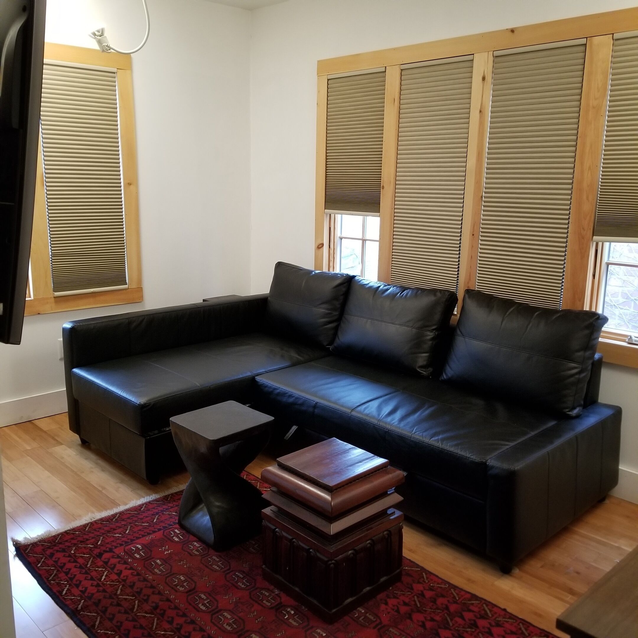 The apartment comfortably sleeps four, with a queen size bed in the main room and a full size Murphy bed near the bathroom. The living space is thoughtfully furnished with a mix of antiques and handmade pieces for a unique and comfortable vibe.