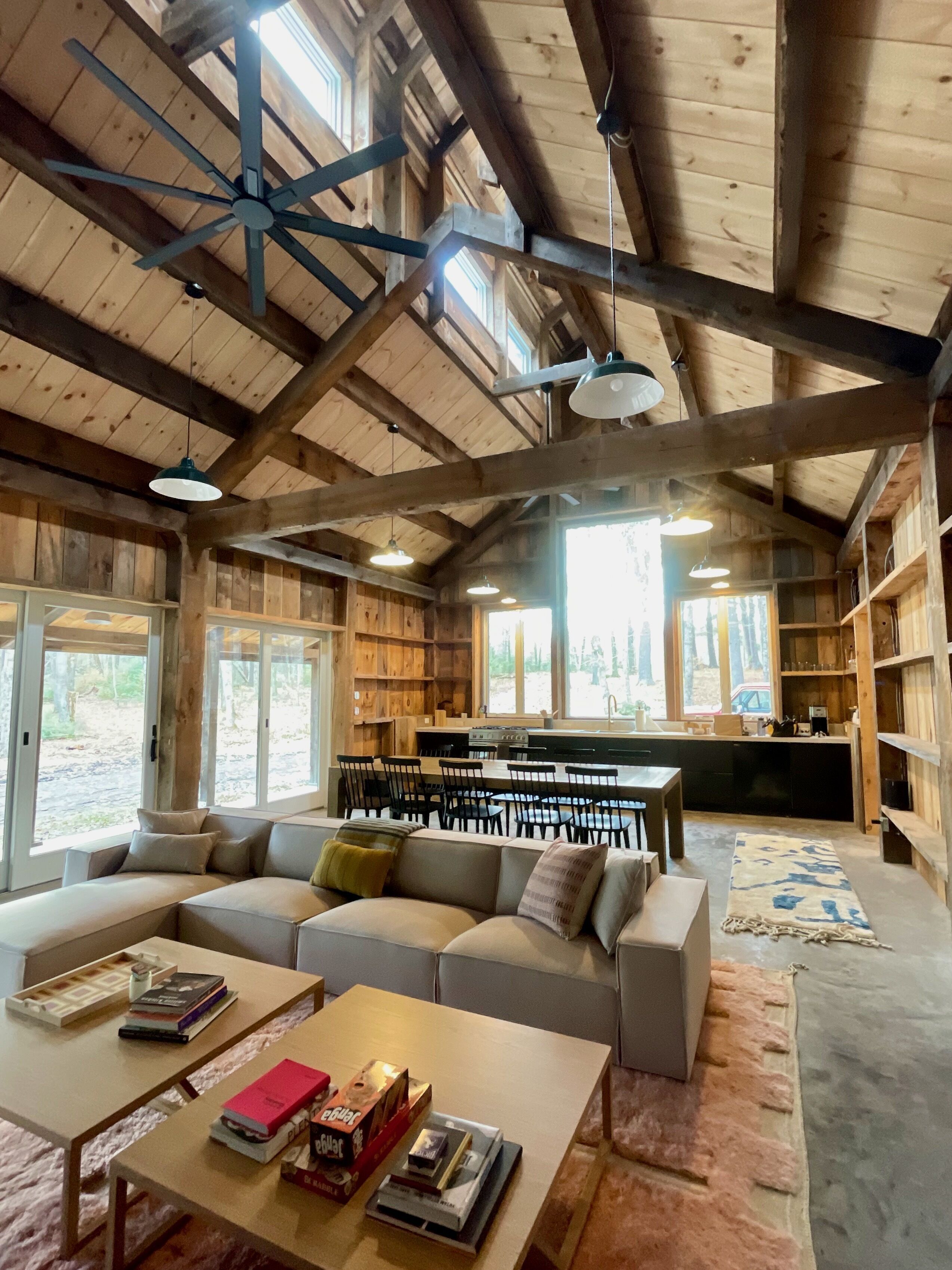 The guest house is a fully renovated barn where the family used to make maple syrup. The "sugar shack" as it's known, has two bedrooms and one bathroom with walk-in shower. The primary bedroom has a queen bed and a large walk-in closet with room for a pack-n-play (included). The second bedroom has a queen bed with a twin trundle below. The main room has 30-foot vaulted ceilings with a wood-burning fireplace, radiant heat floors, a dining table for 10, and a modern open kitchen.